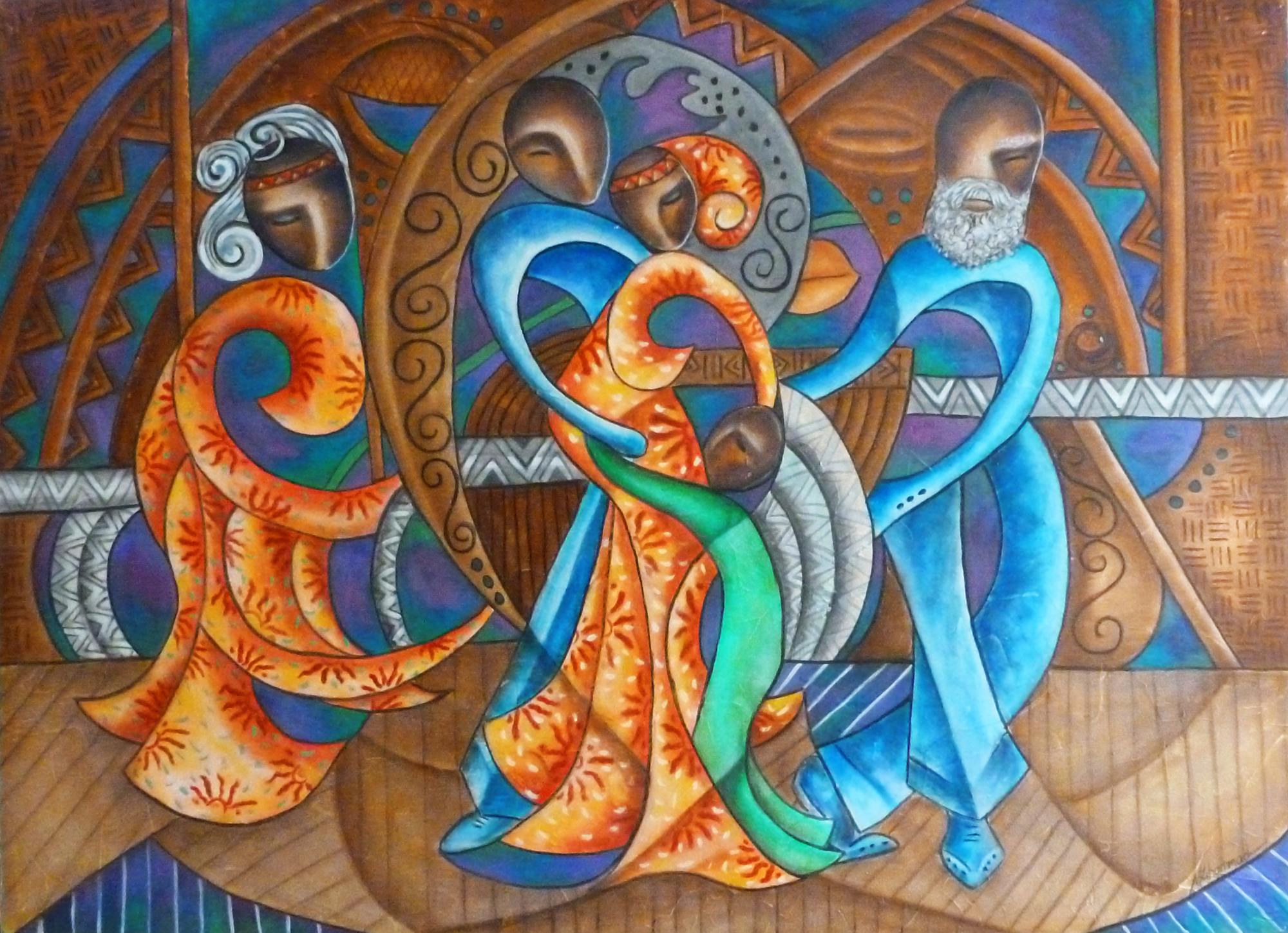 This vibrant painting by Marcella Hayes Muhammad showcases a young family of three embraced by their elders, embodying the spirit of unity and celebration within a family. Utilizing her signature style of Plastic space abstraction, the artwork emphasizes the interconnectedness of generations, illustrating how each member contributes wisdom and support for future growth. The rich cultural elements in the background pay homage to ancestral contributions, further enhancing the narrative of legacy and familial bonds.