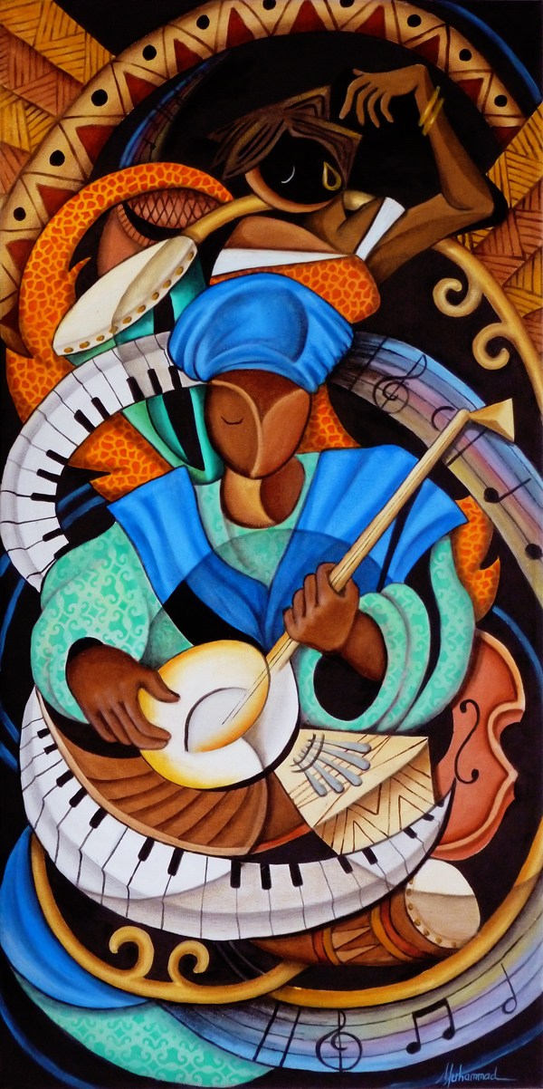 This Plastic Space or “Plasticism” abstract painting captures the rhythm of a musician as he performs rich cultural music. The dancer behind him performs her artistic rhythmic dancing with sweeping motions reminiscent of flamenco dancers. Musical notes, instruments, and rich cultural elements swirl around them. This painting began as a sketch in graphite with the musician only. It was while actually painting on the canvas in oils that the dancer was added. Working on balance and color is critical and this painting took a while to complete, about a month.