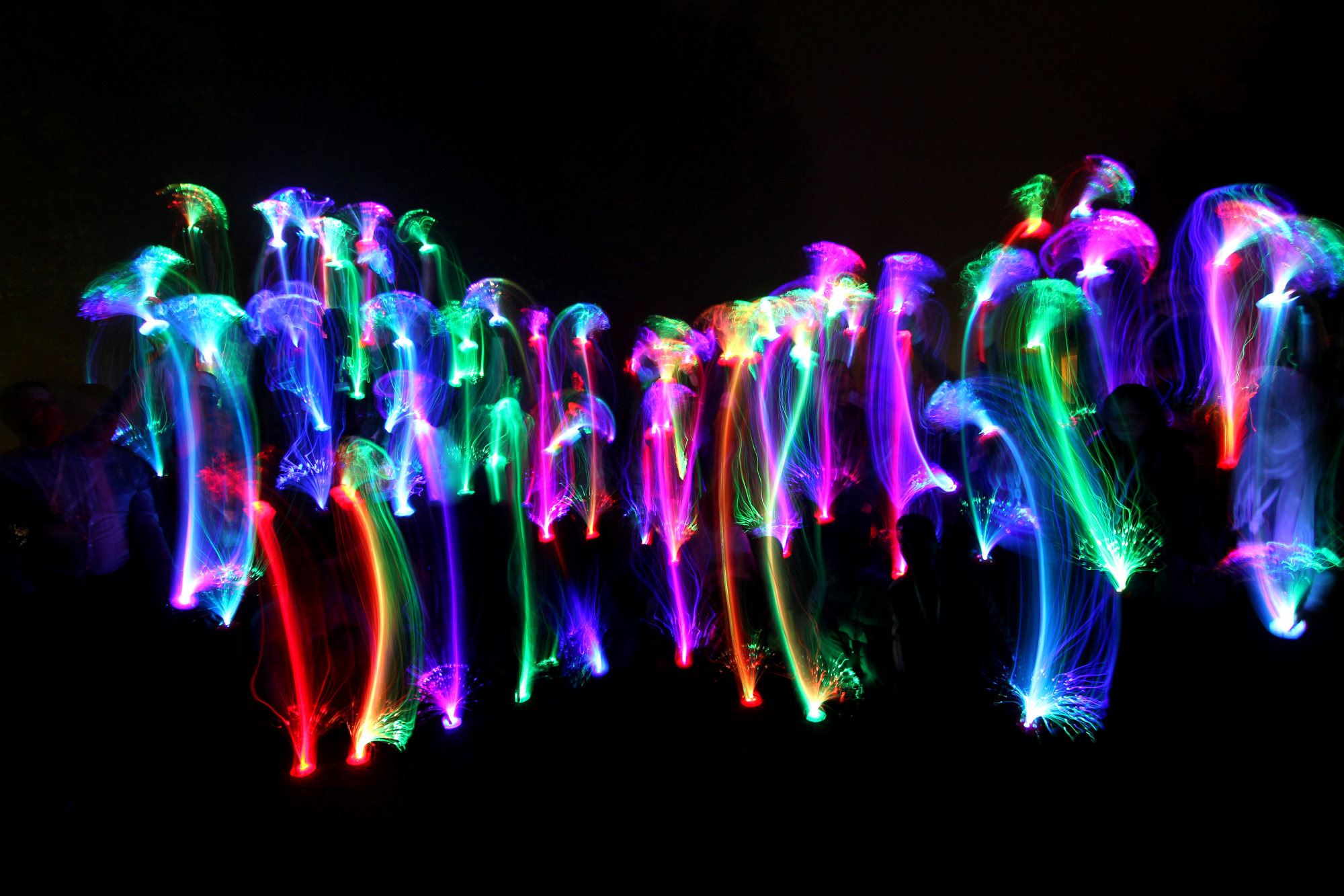 Participants of the Fiber Optic Conference building a collective installation; laser and fiber-optic lights; Hogsback, Eastern Cape, South Africa.