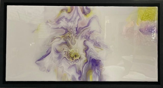 Orchid by Marcy Stone  Image: Shimmers of lavender, honeycomb and golds.  Complete with a resin finish and a black oak frame.