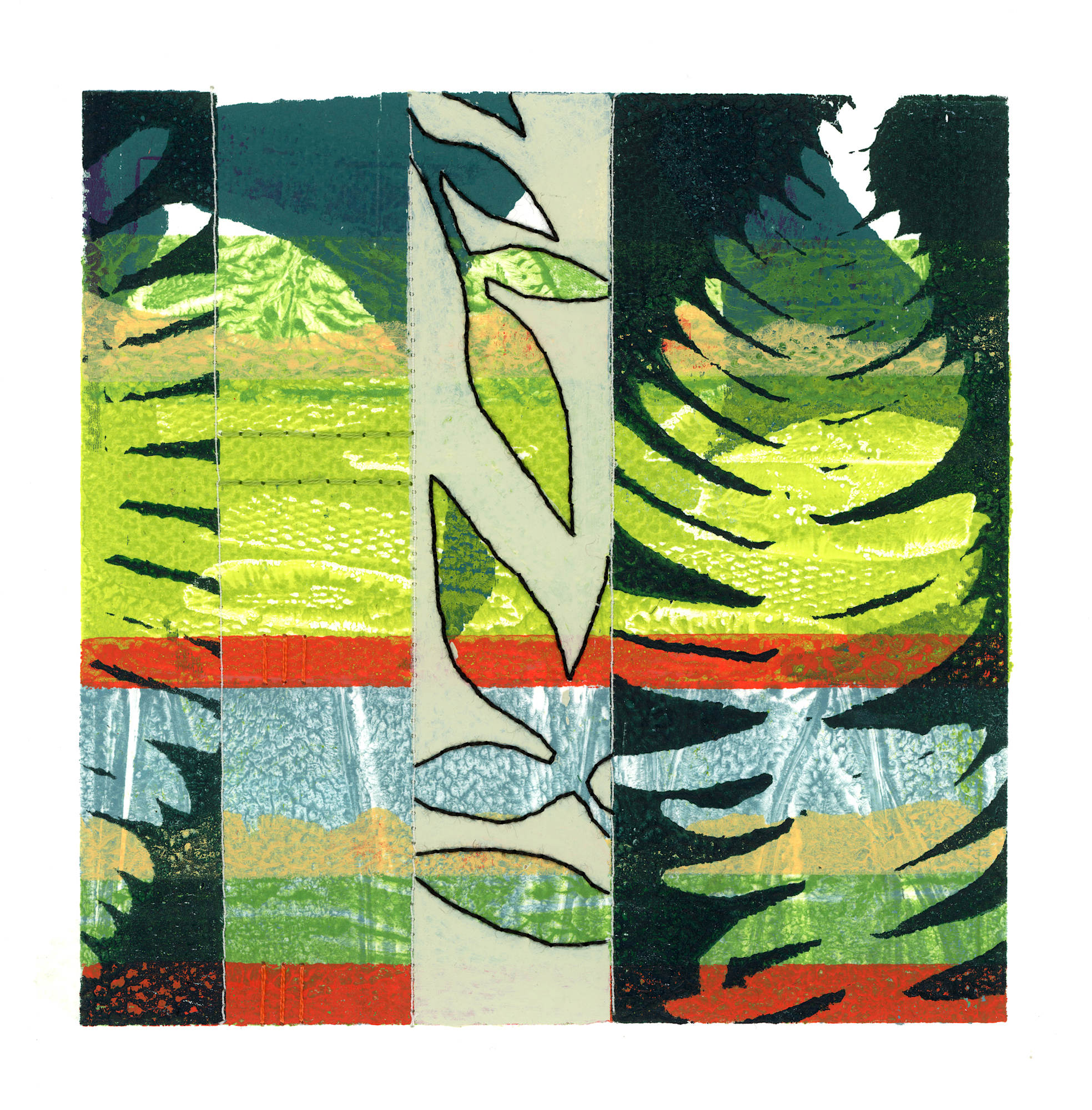 This piece is a monotype created with a gel printing plate, acrylic paint, and real plants. After printing, embroidery was added to emphasize certain lines or shapes.