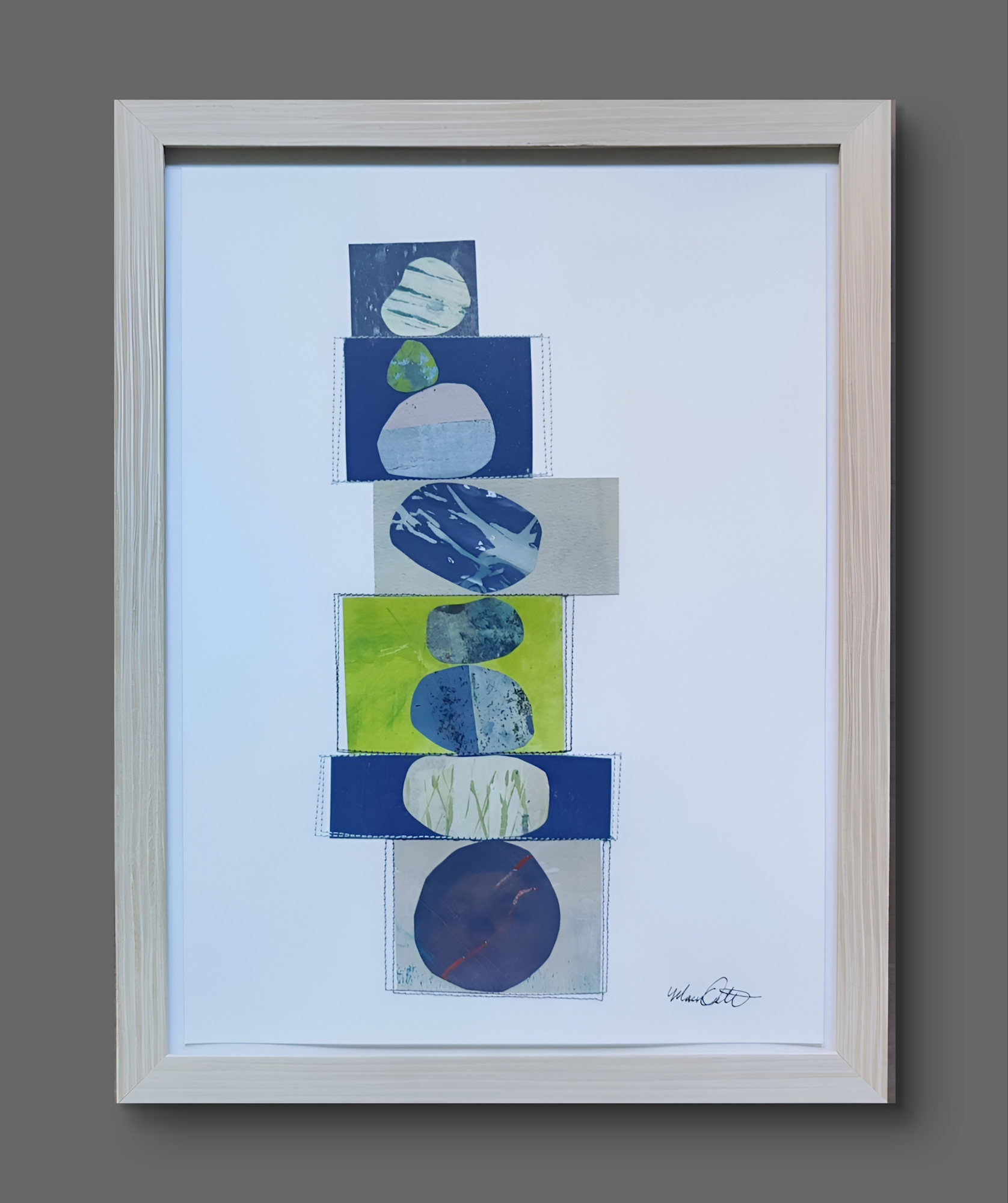 Mixed media collage with machine stitching on watercolor paper.