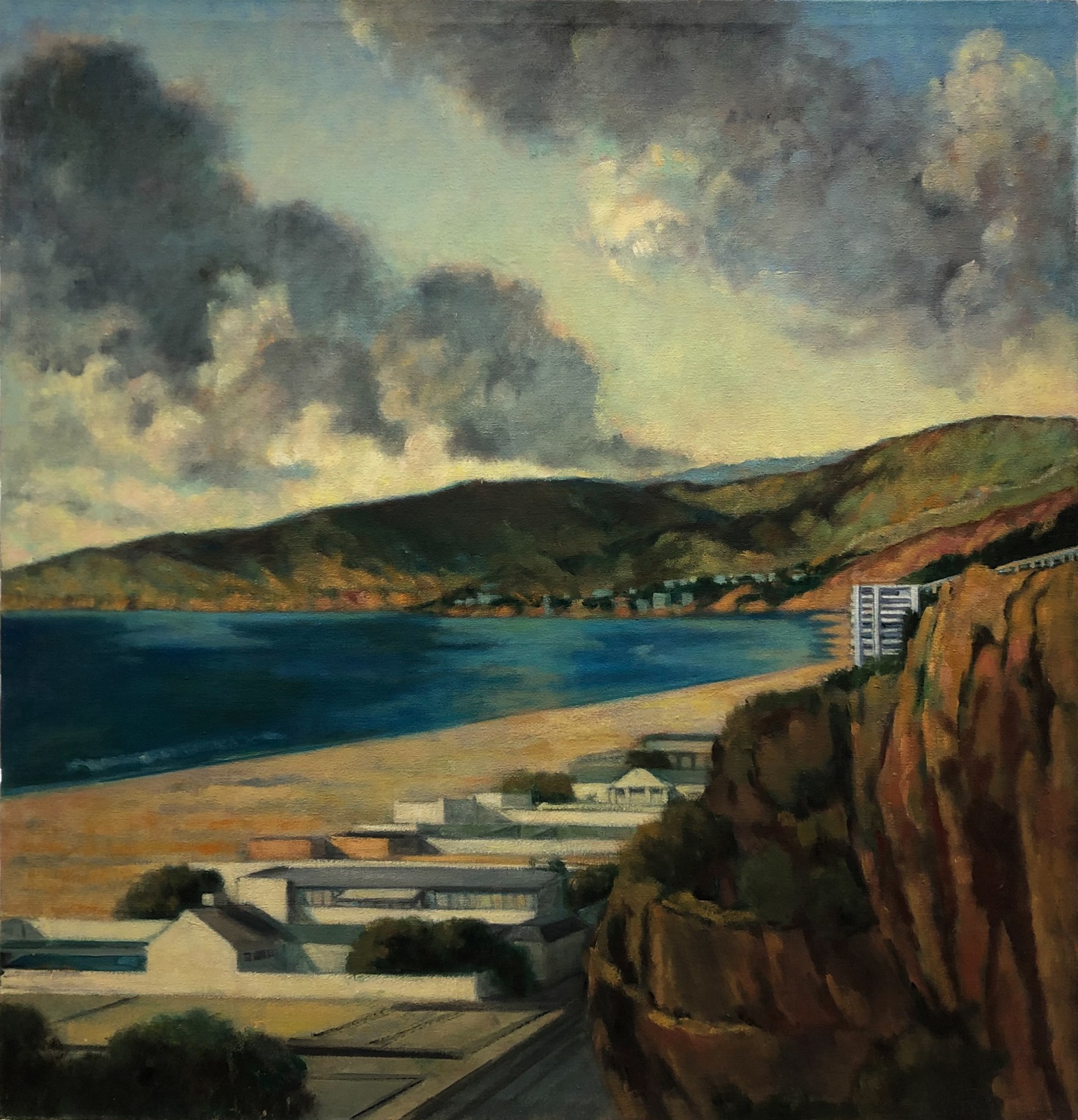 Landscape scene of cliffs and buildings north of Santa Monica, the ocean at center and the land curving toward Malibu from right to left. This painting was used on the cover of the 2007 book "Hometown Santa Monica, the Bay Cities Book."