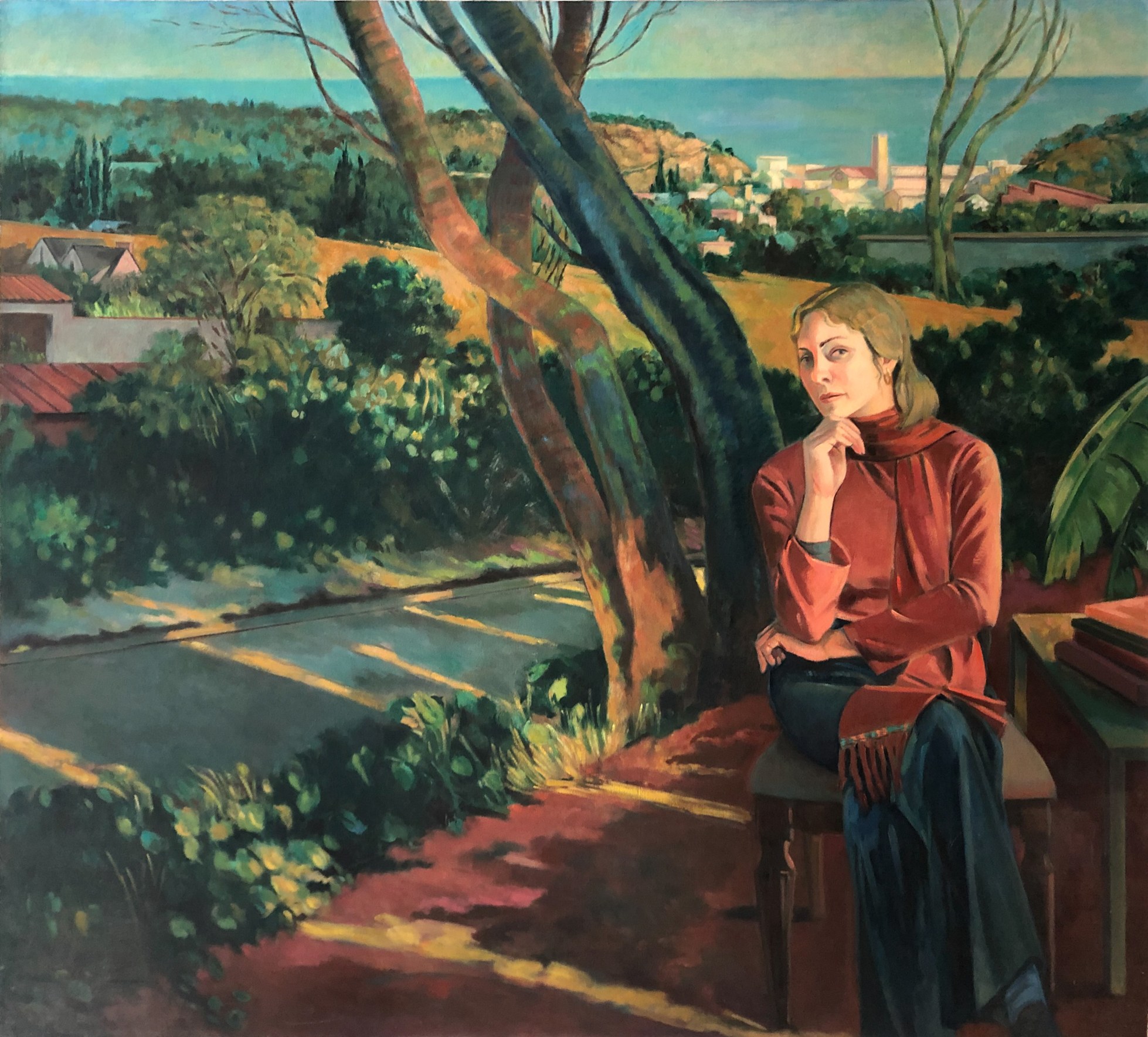 Seated female figure at the right, a view of a tree and road at the center and a vast landscape view in the background