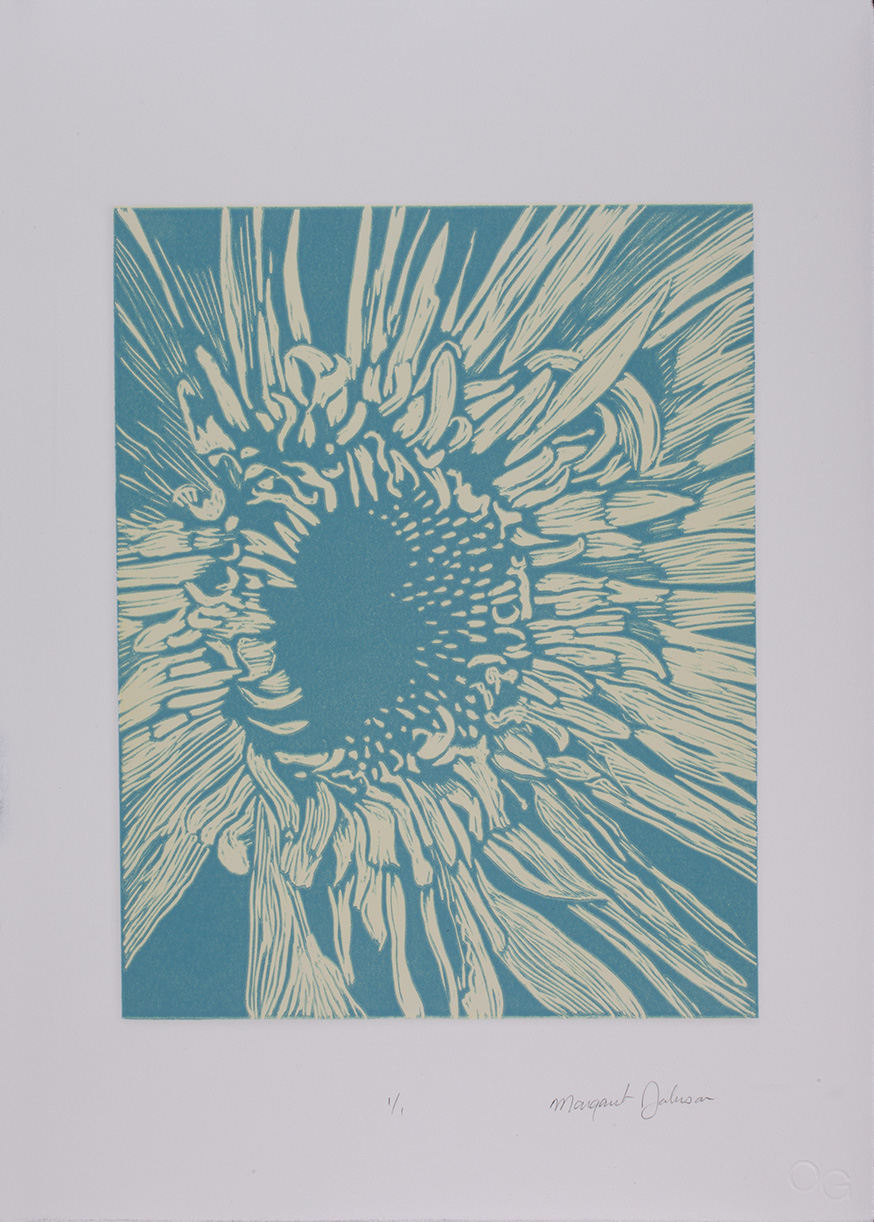 Yellow Green Crysanthemum flower printed on Arches 88 paper created from a hand-carved block print using multi-layered oil-based inks. Inspired by one of my original macro flower photographs.