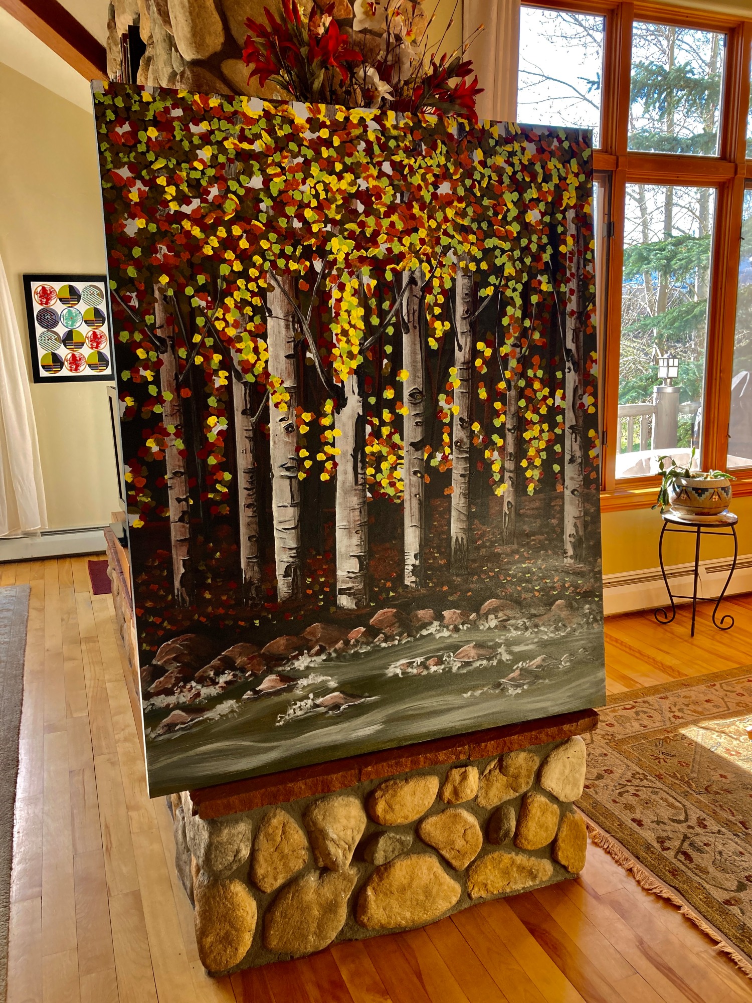 The path behind the Riverwalk shopping area is such a lovely oasis. This is my inspiration. Recovering from a broken arm, much was painted with my left arm while my favored right arm was recovering. This composition is also public art located on the north west corner of the Riverwalk Movie Theater.