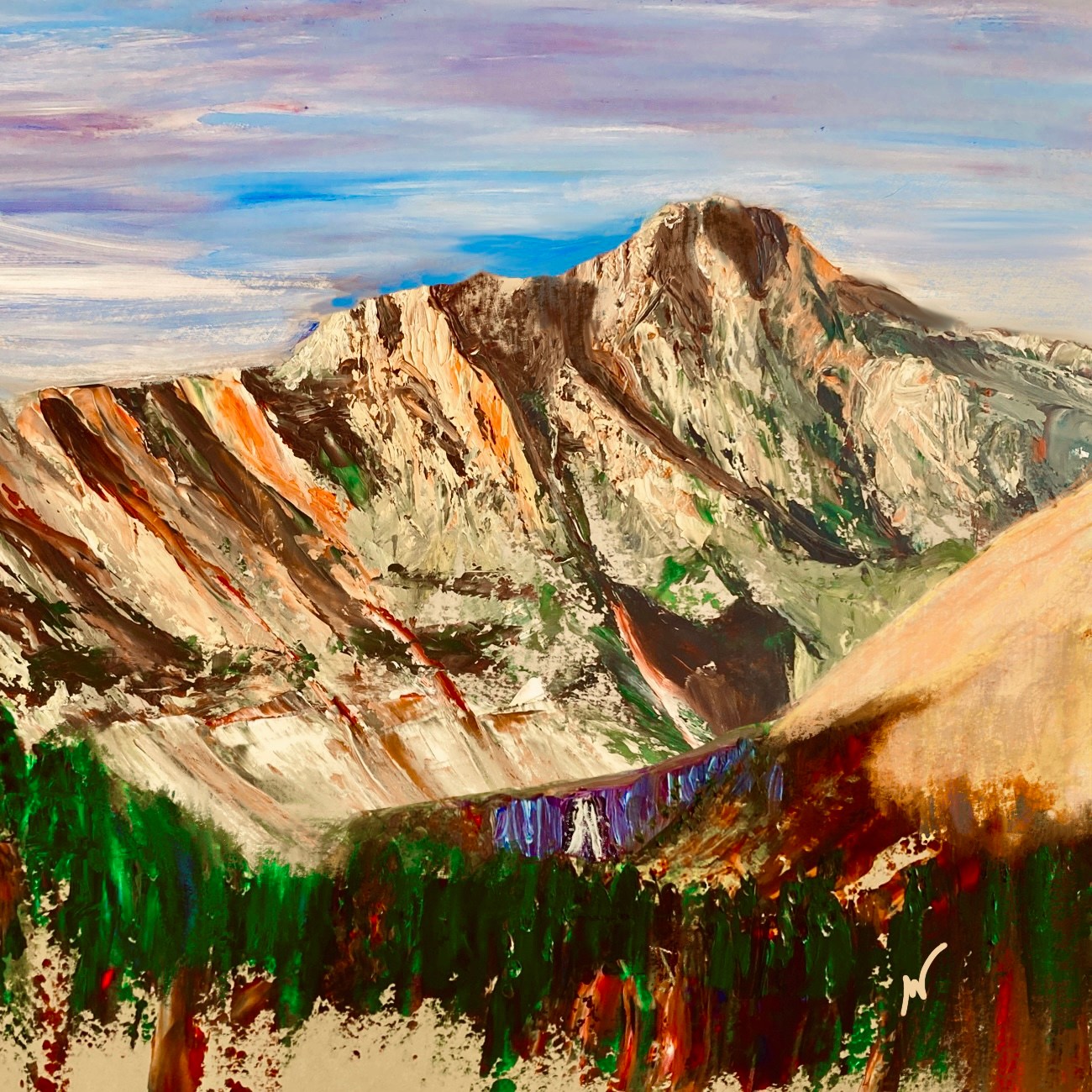My husband has completed all the #14ers and asked me to paint this from a photo reference. I’ve hiked most of the easy ones but can’t imagine being on Class 3+. Perhaps I’ll have to hike into just this beautiful basin. Oil on 12x12” paper. Digital prints up to 15” $50. available. Several filters available.