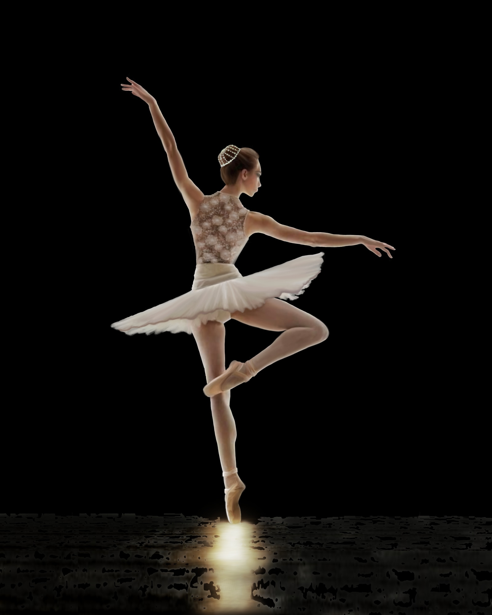 Passé Ballerina in White Classical Tutu with Sequins One Arm Overhead on Black Background