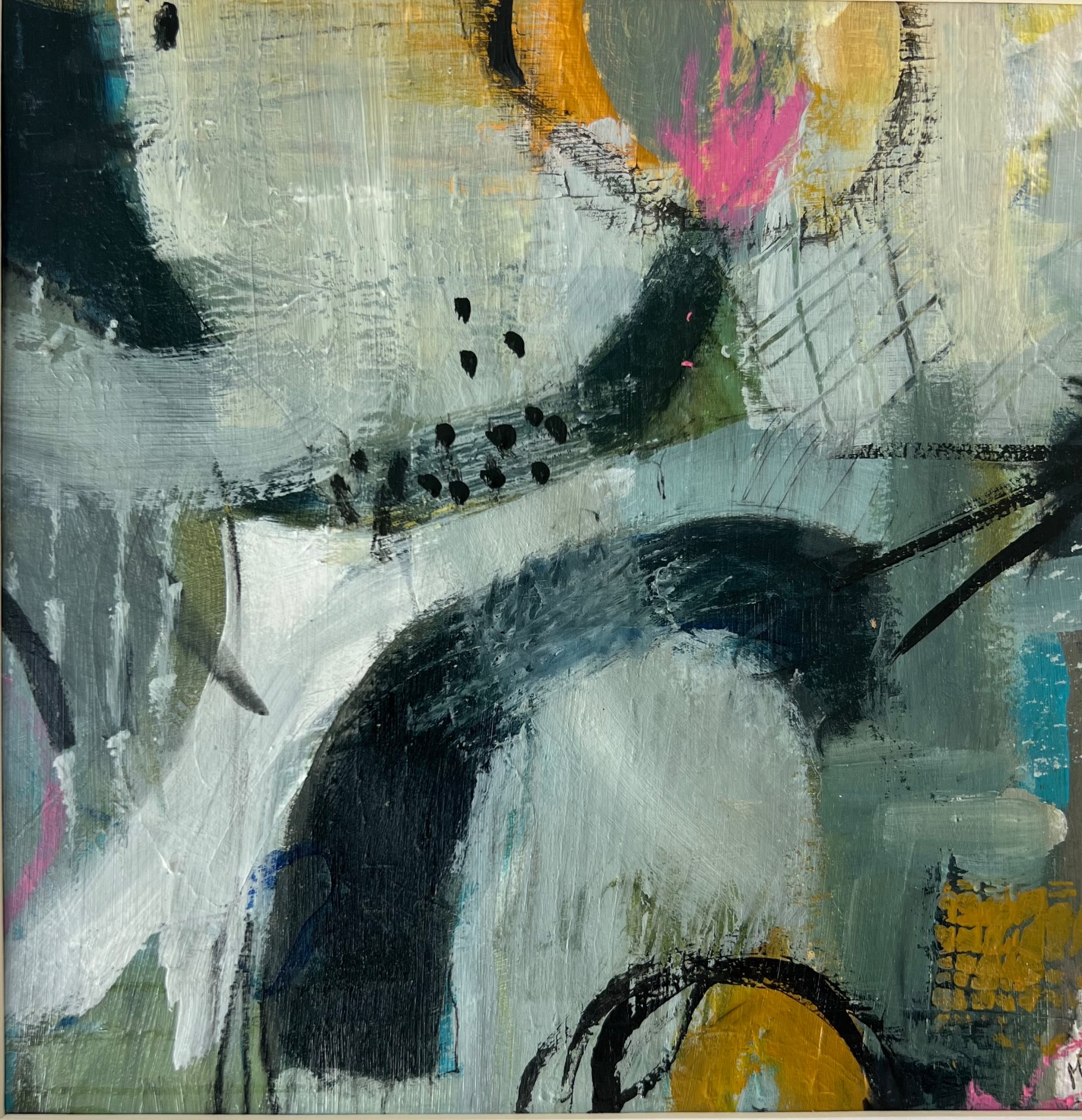 Playful pink and warm ochre provide the spark to this cool sage green gray composition. This piece is filled with movement and surprise.