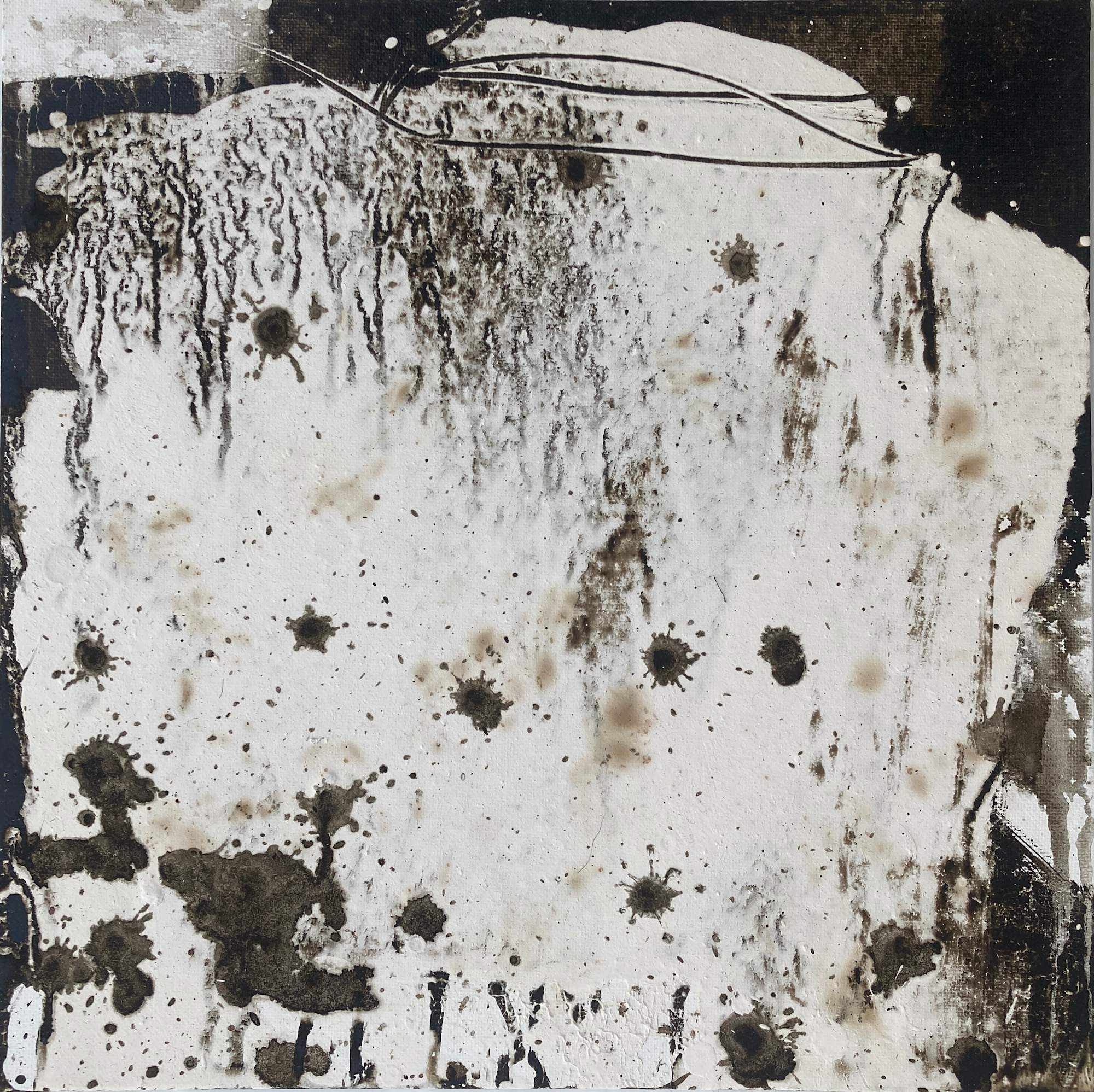 This artwork is an abstract acrylic mixed media piece on primed bookbinding cardboard.