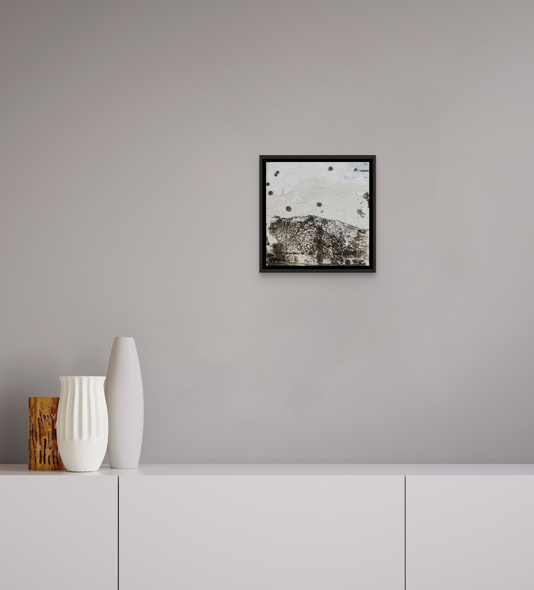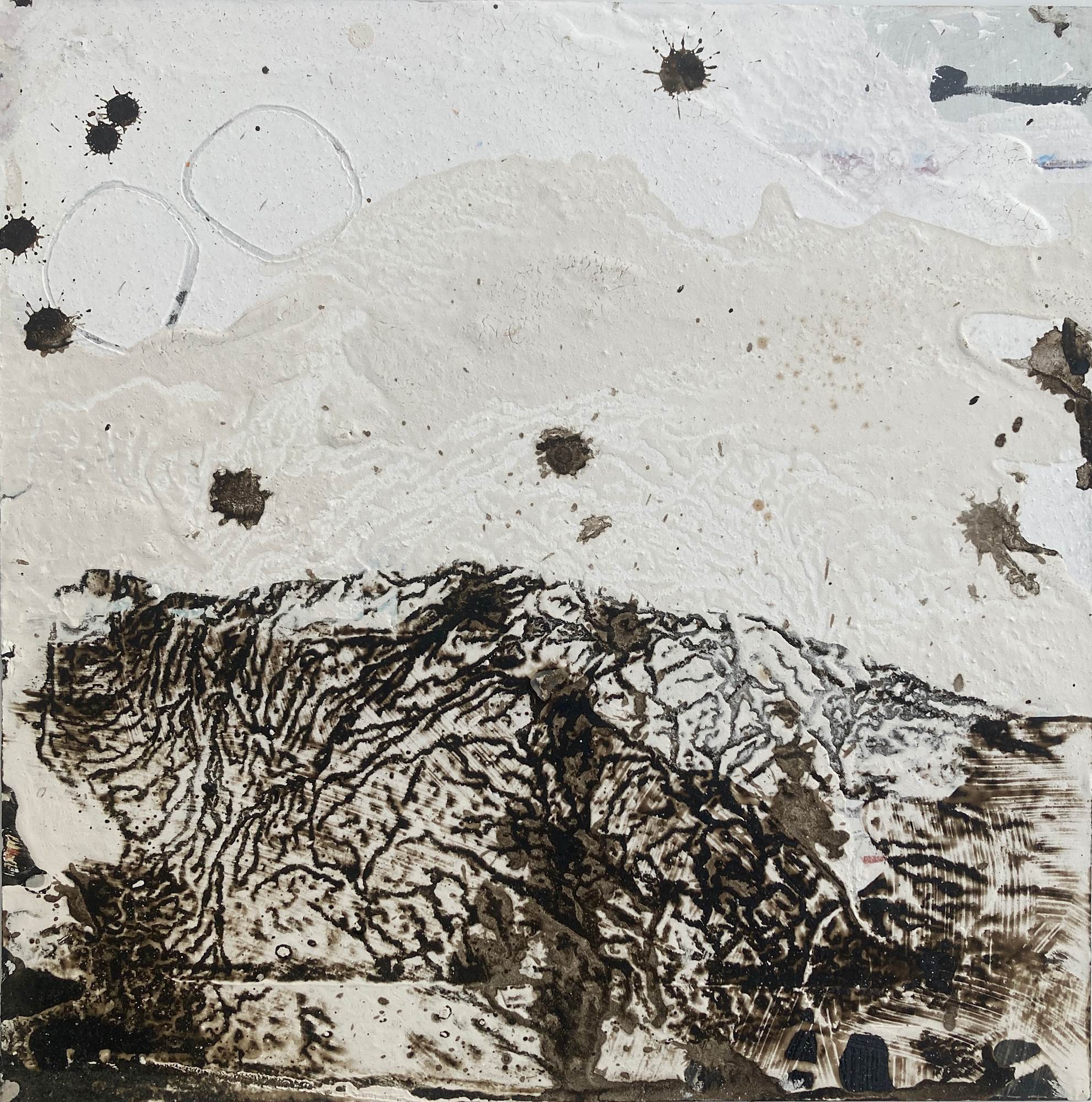 This artwork is an abstract acrylic mixed media piece on primed bookbinding cardboard.