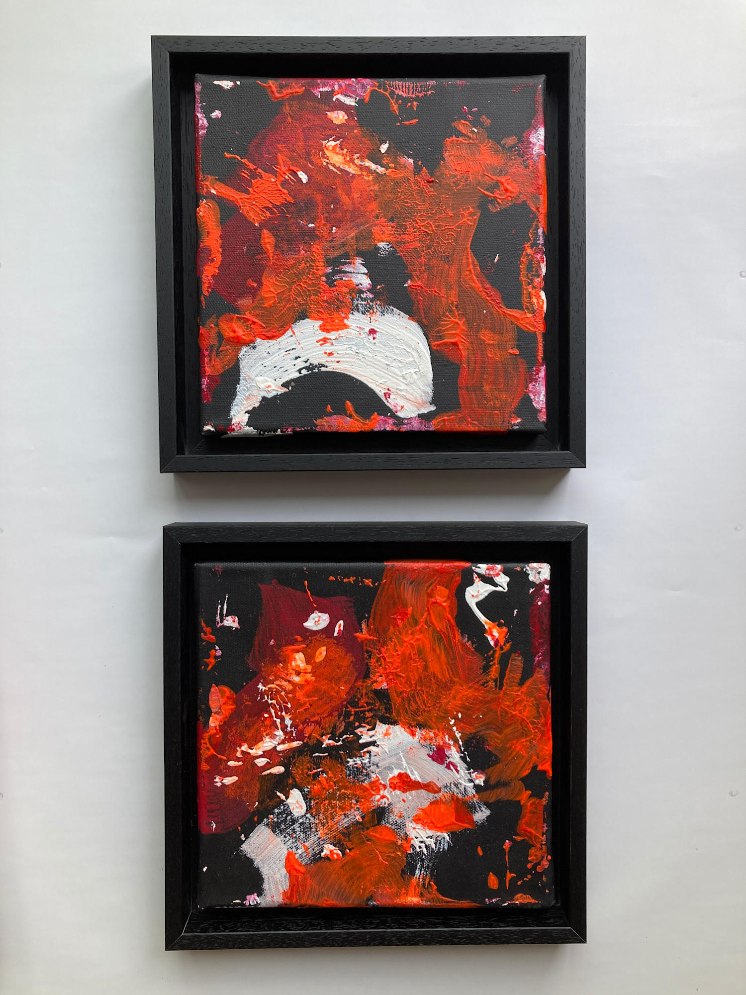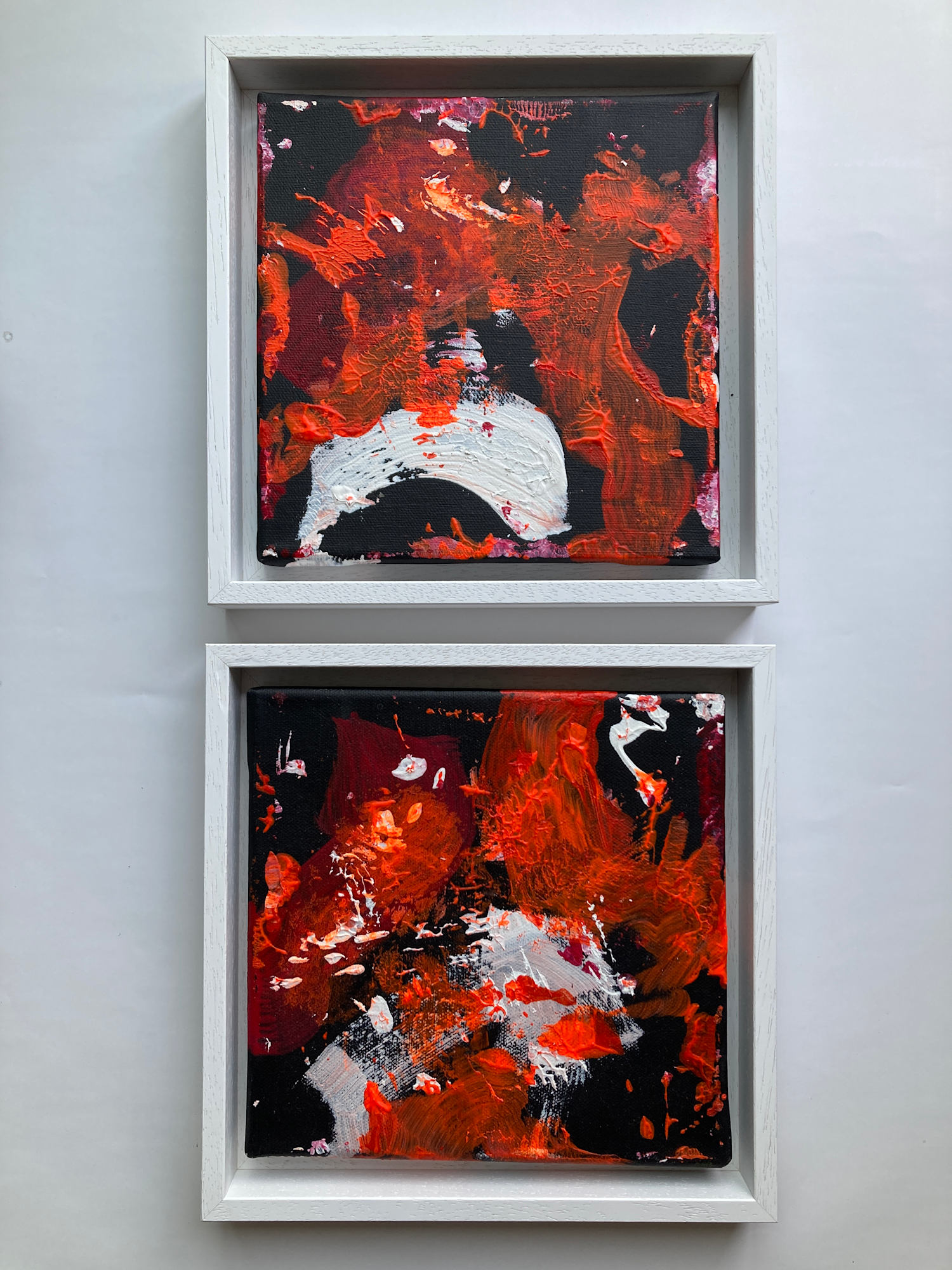 This Artwork is a set of two paintings, each 20x20 cm. They can also be hung all four side by side or with each other. Signed and dated on the back so you can choose the direction of hanging each painting. No wire to hang needed.