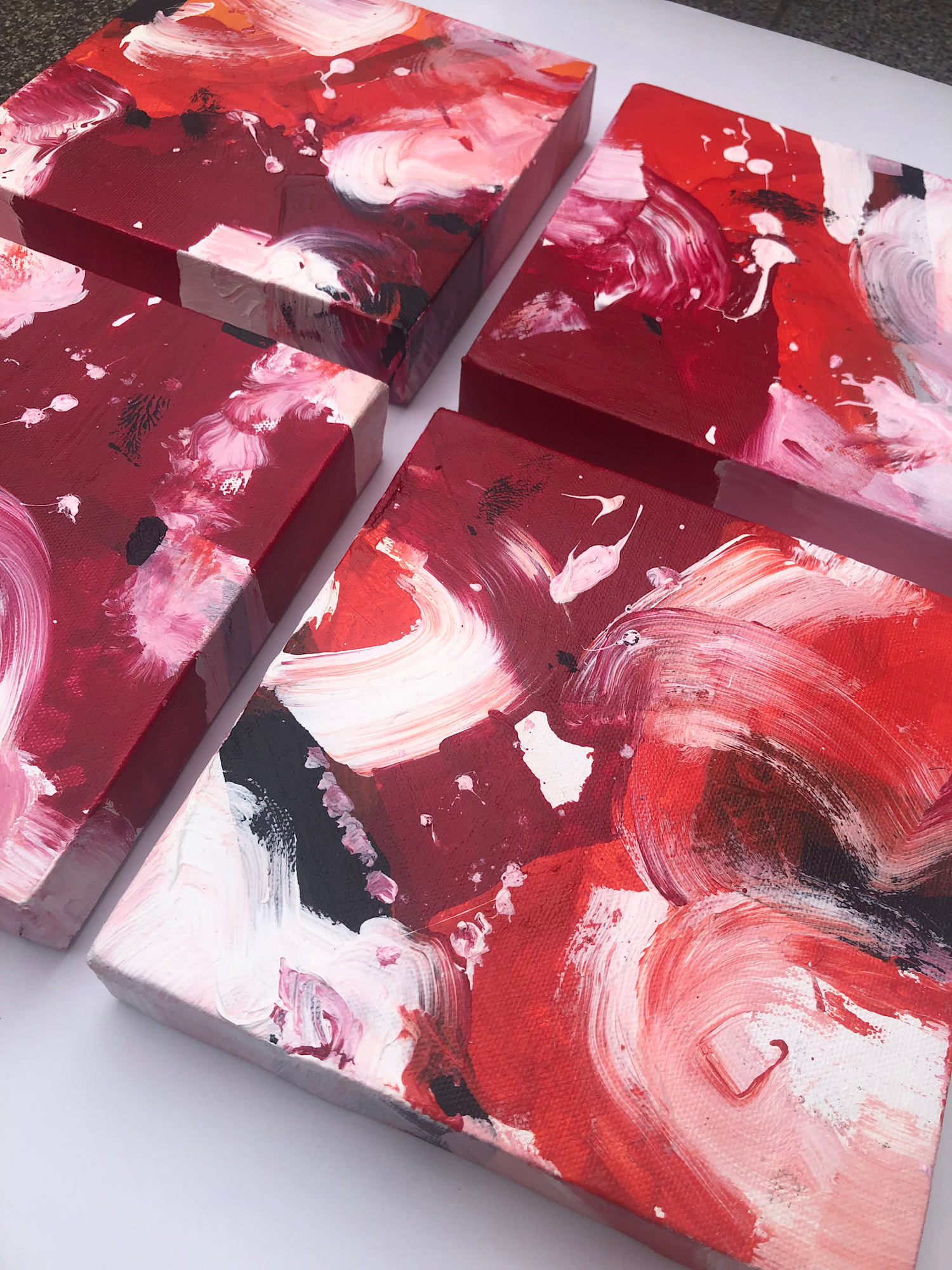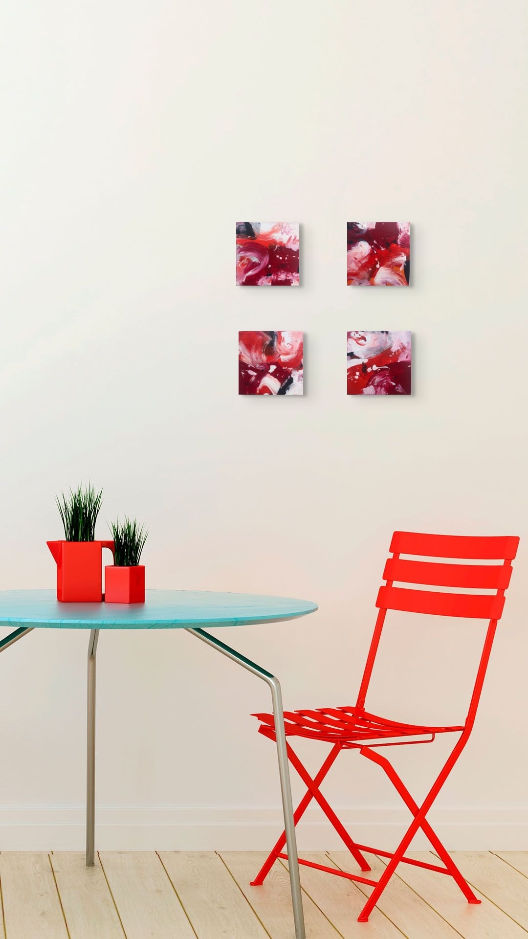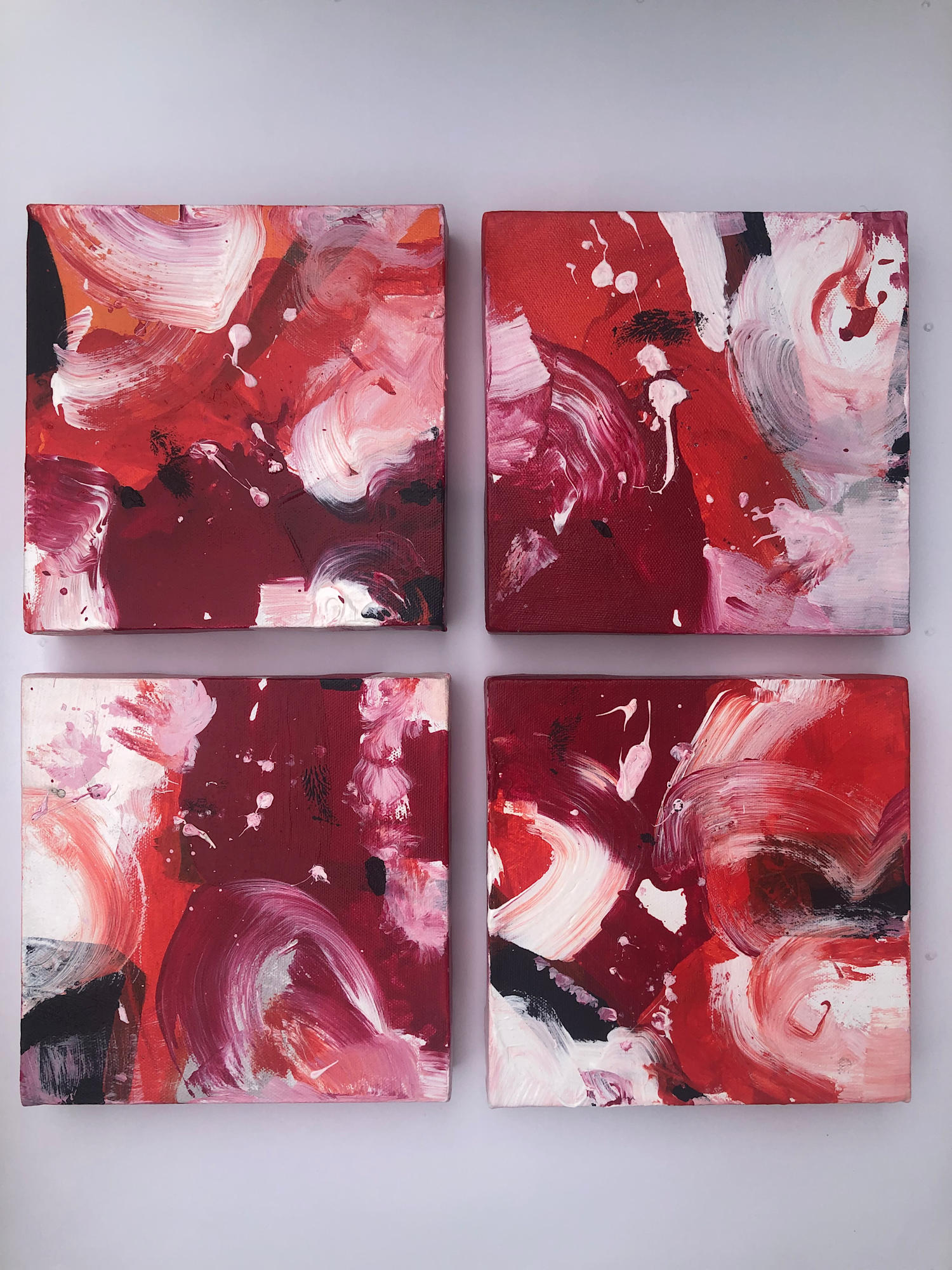 This Artwork is a set of four paintings, each 20x20x4 cm, so all together about 45x45x4 cm in square hanging. They can also be hung all four side by side or with each other. Signed and dated on the back so you can choose the direction of hanging each painting. No wire to hang needed.