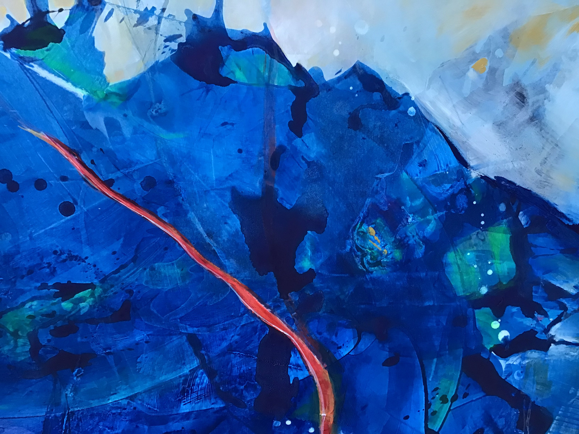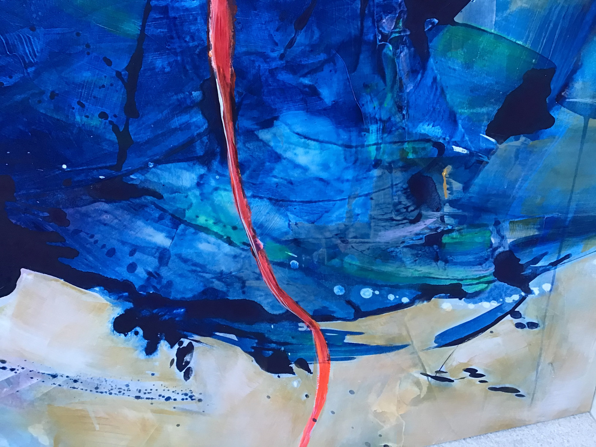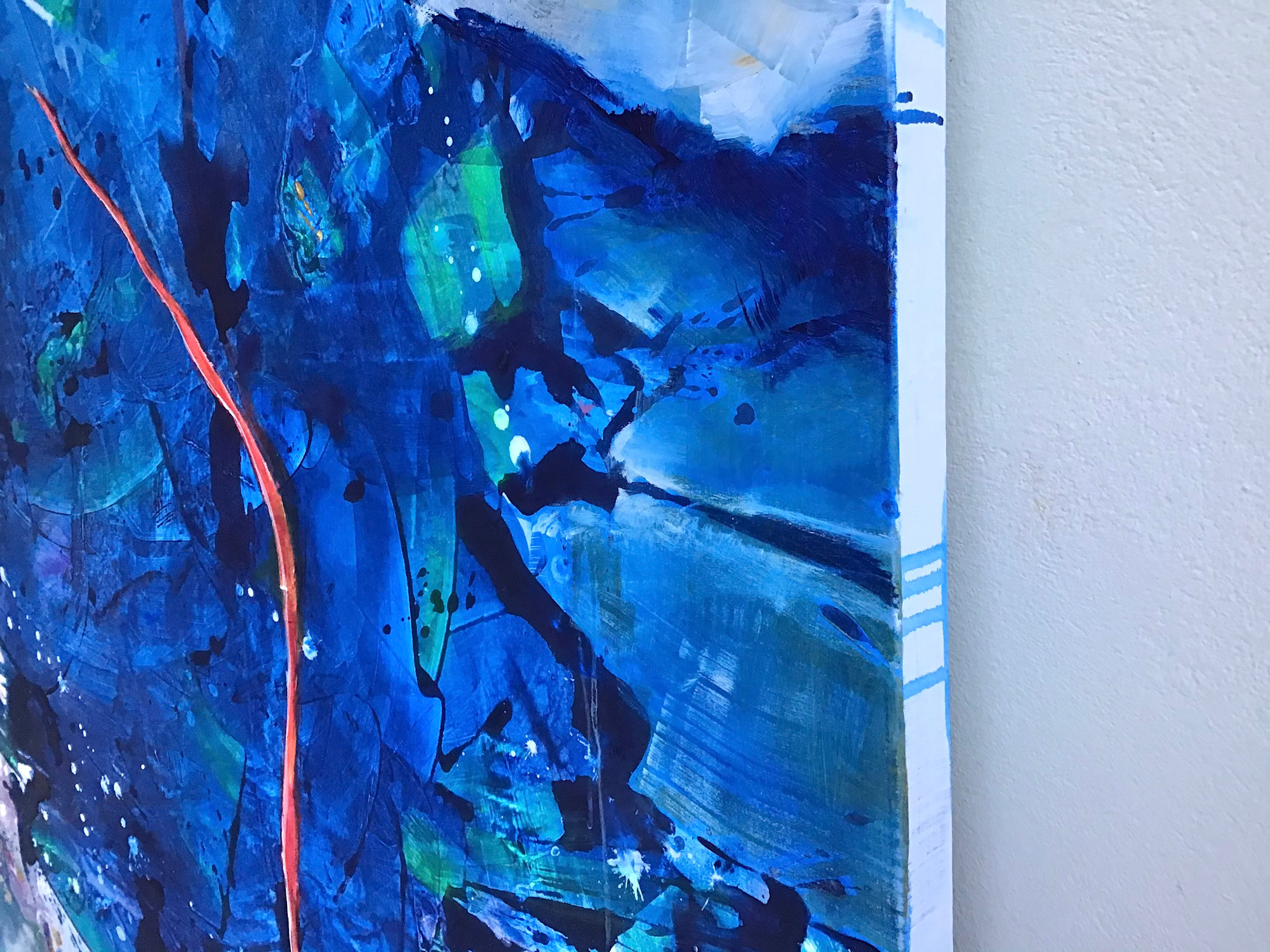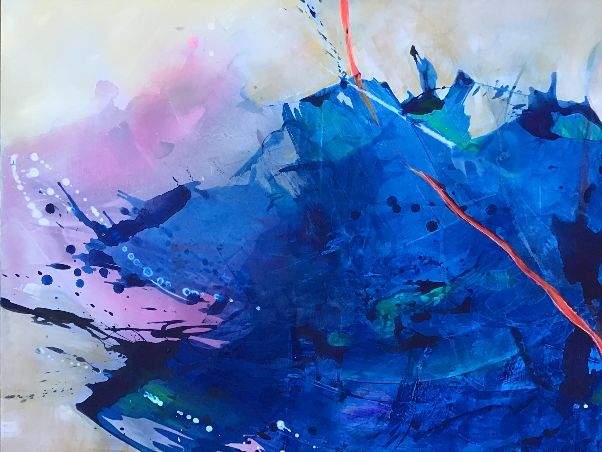 DESCRIPTION: This painting is about overcoming everything that was meant to destroy us. One of the last of the Quarantine collection of the artist, one of the last of this strange year 2020. A big blue, dynamic splash dominates the artwork and is surrounded and supported by gold, white, and pink, that uplifts the atmosphere. The red line reinforces the composition and amplifies the essence of this unique artwork.