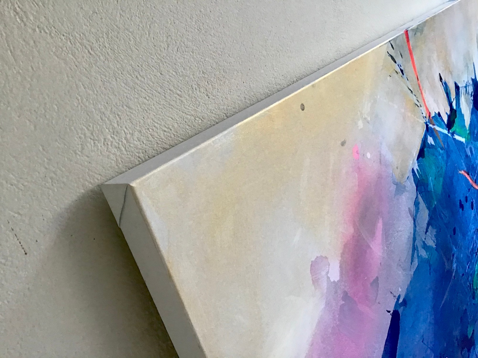 READY TO HANG: It is unframed, but ready to hang. At the sides, there are stripes of paint from the creative process. Look at the detail photos. It is wired.