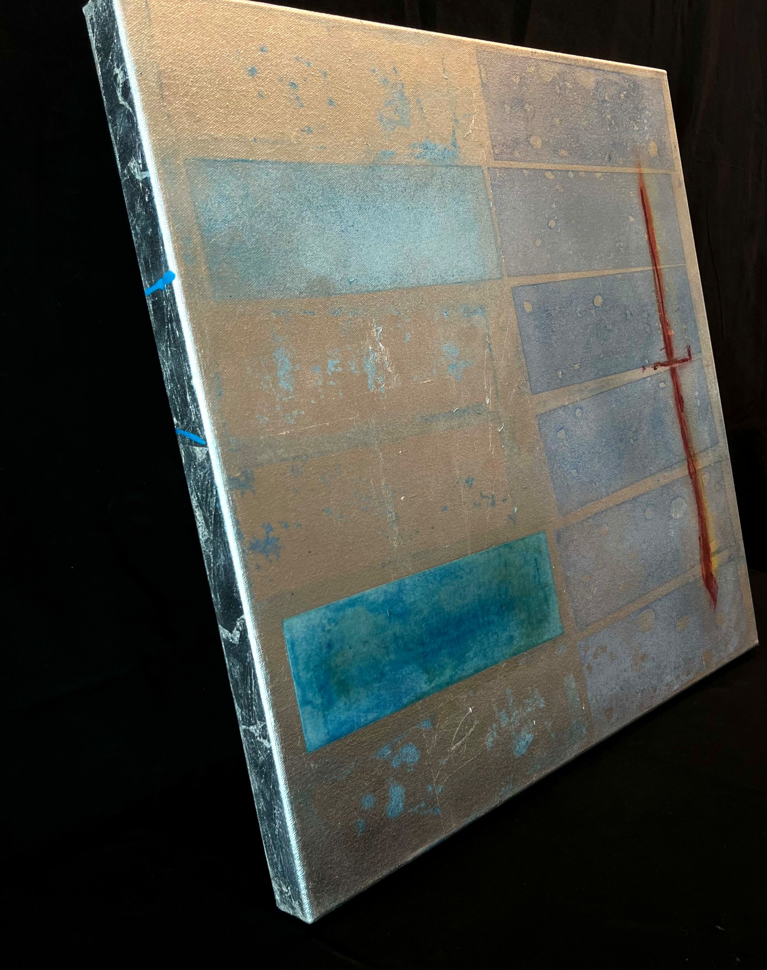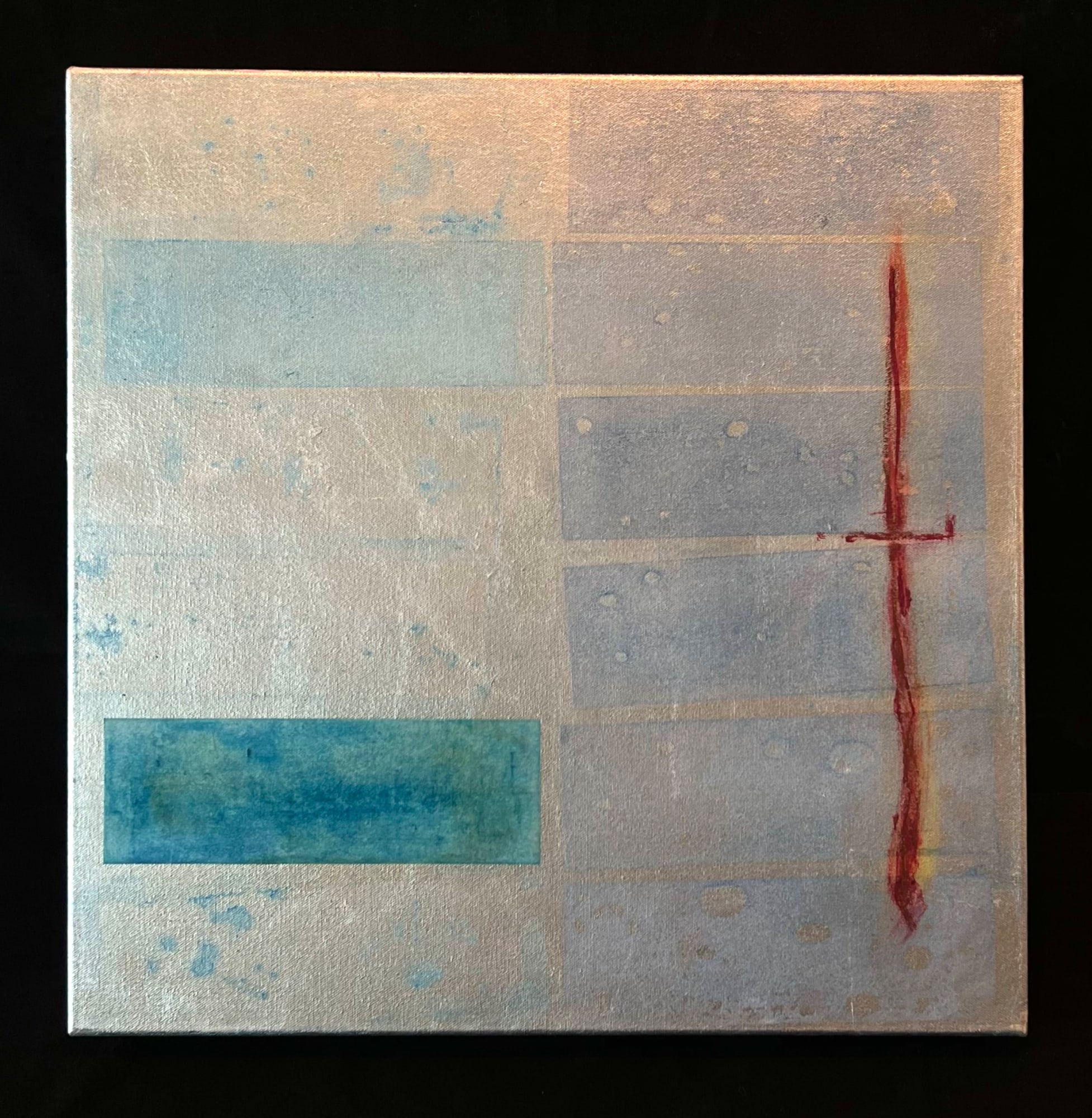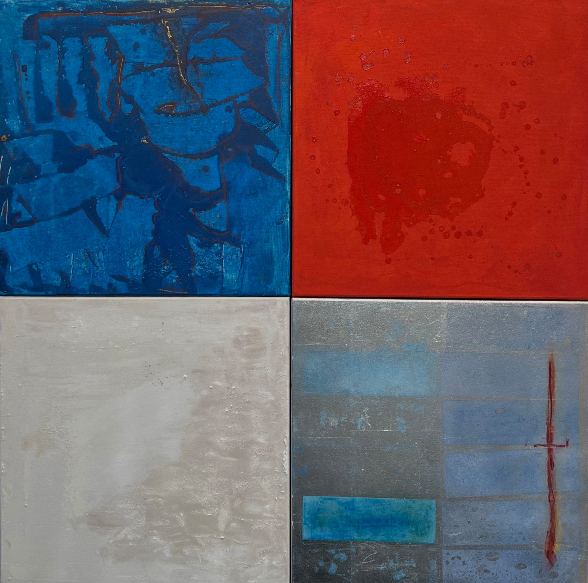BLUE TRACES, WARM RED, WHITE FIELD AND SILVER WITH BLUE RECTANGLES