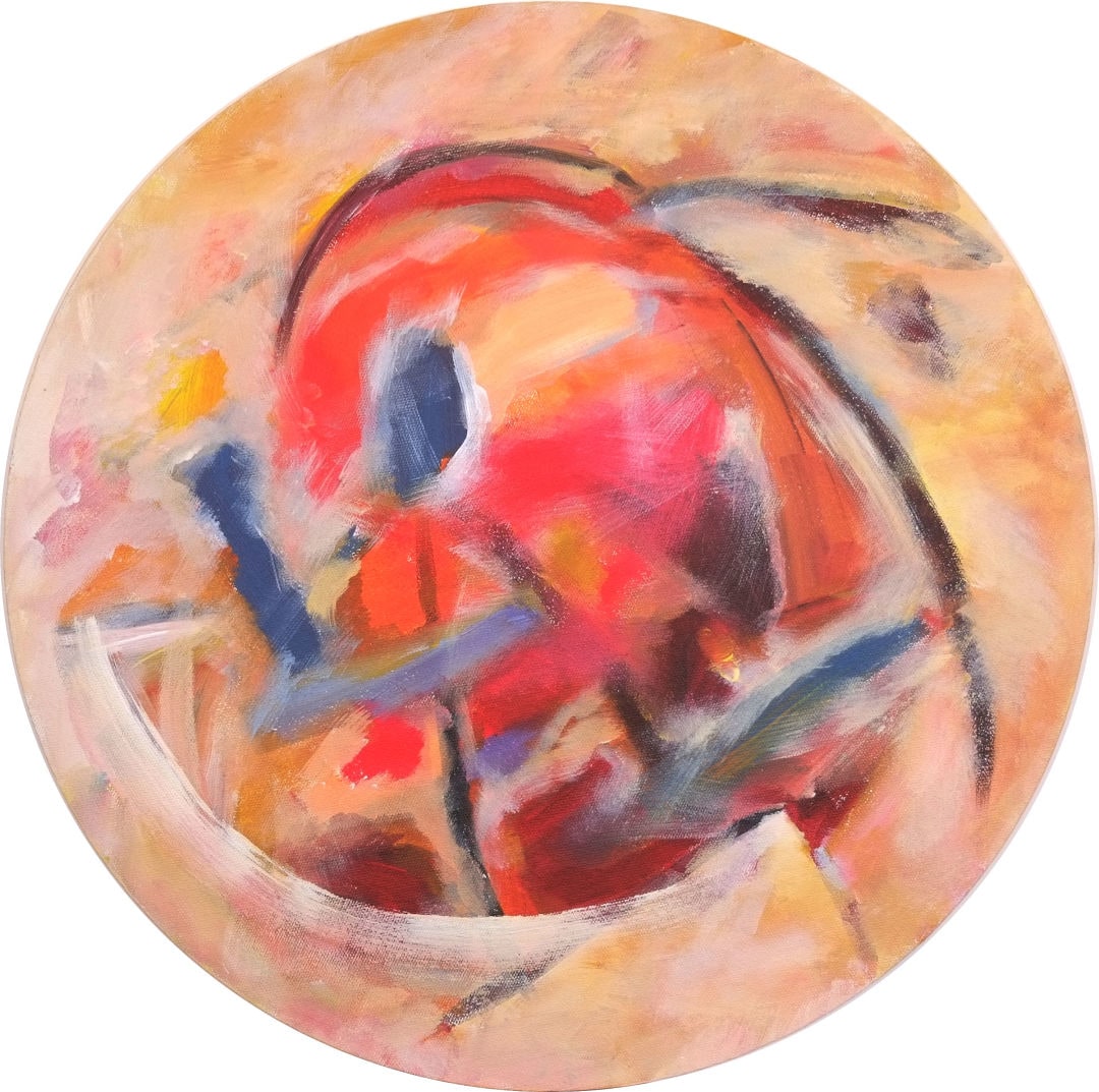 Circular painting. Edges finished with copper nails.