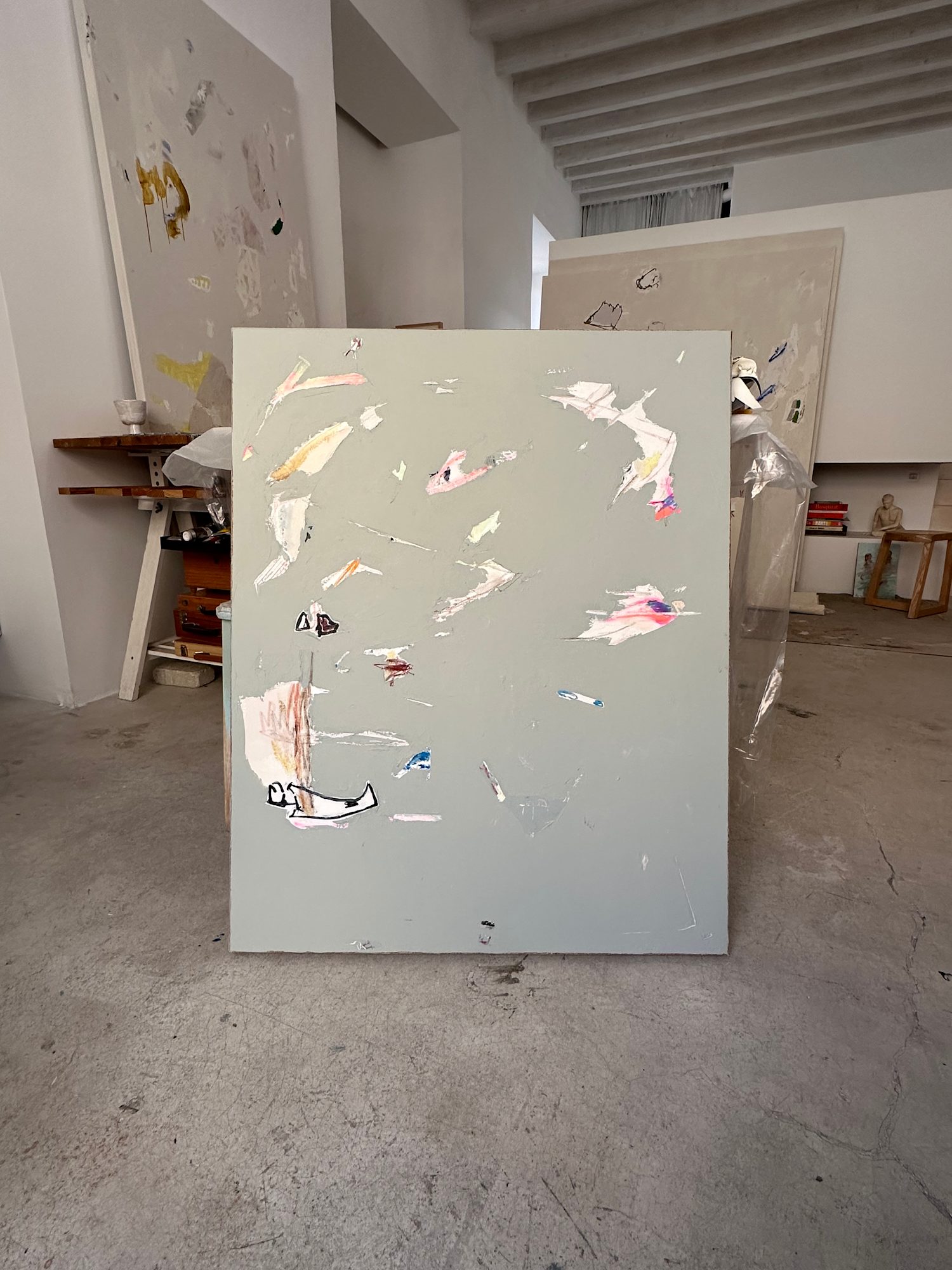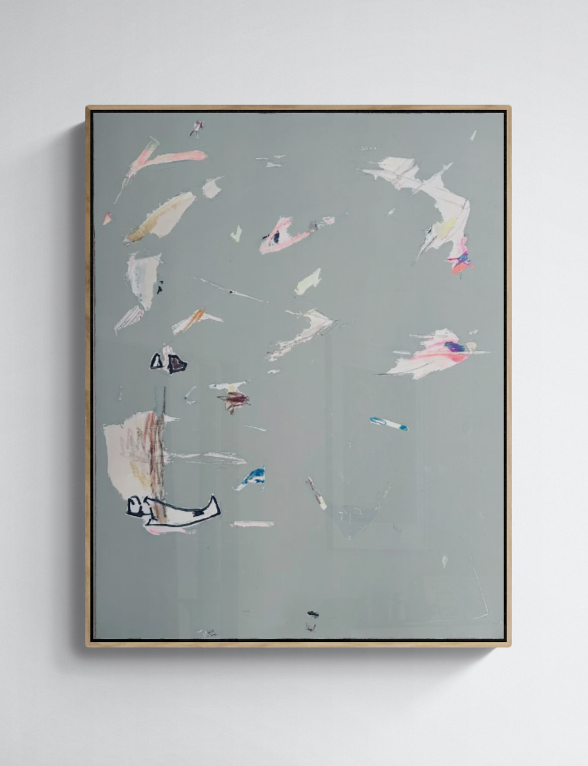 Acrylic, collage, plaster, charcoal, pastels and graphite on canvas