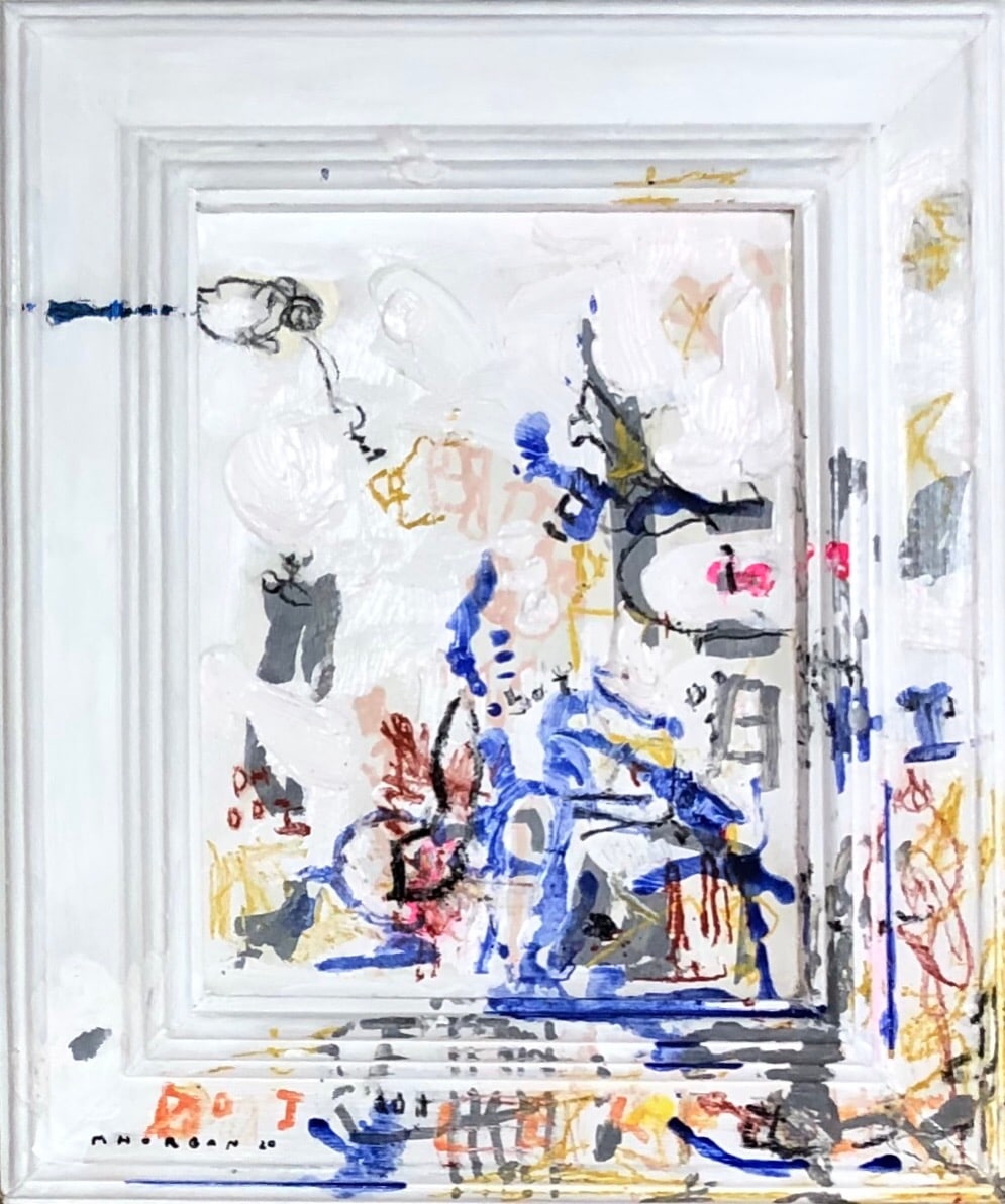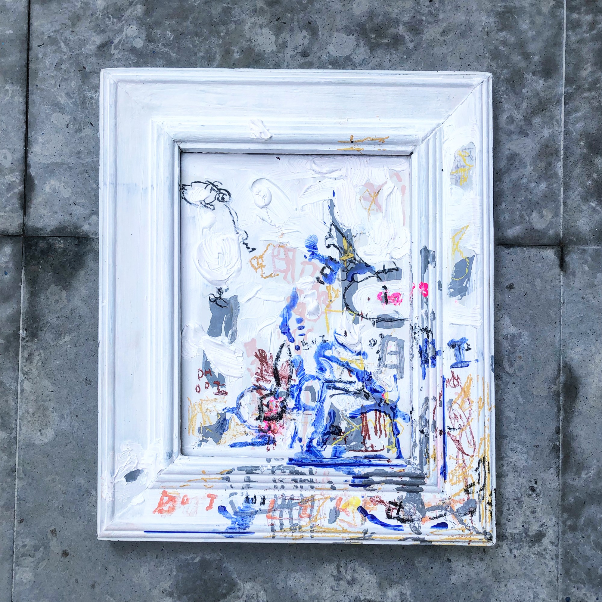 Acrylics, oils, charcoal, modeling paste, collage and pastels on antique wooden frame