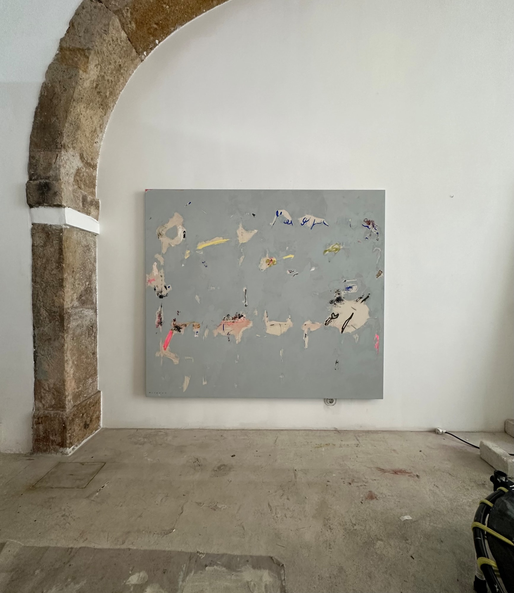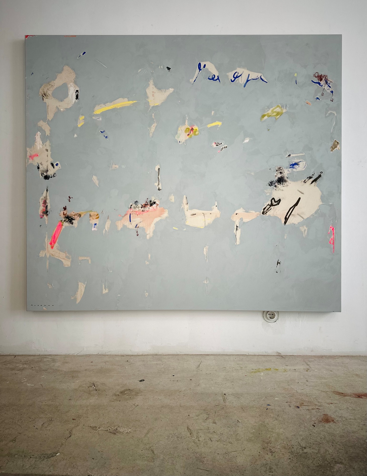 Acrylic, collage, plaster, dirt, charcoal, pastels and graphite on canvas
