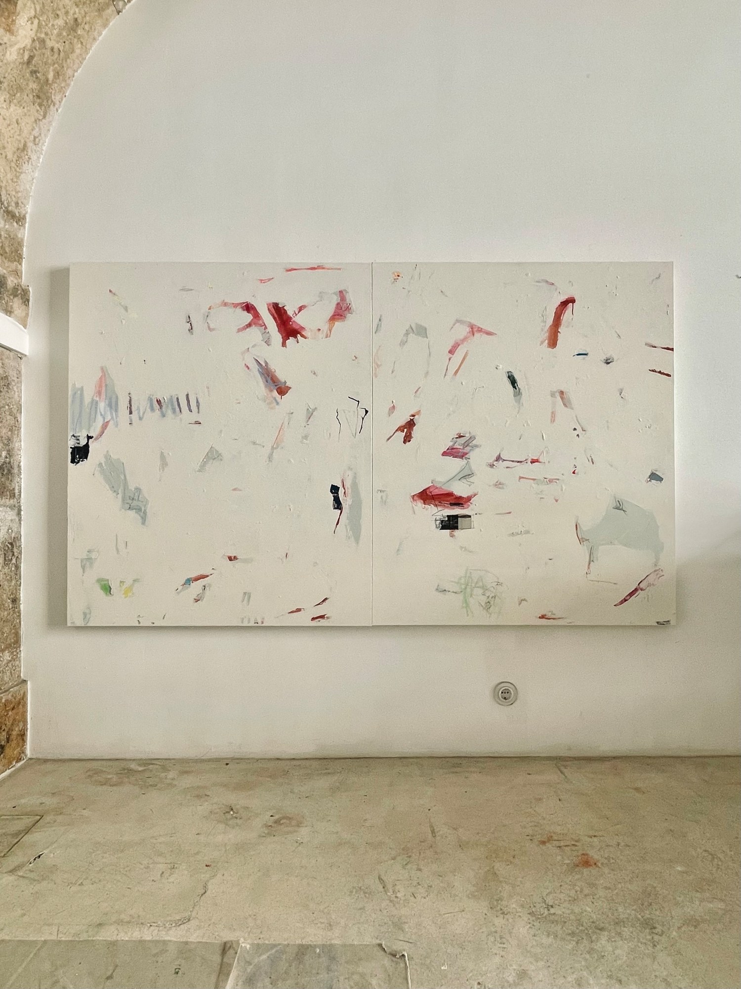 Acrylic, collage, plaster, charcoal, pastels and graphite on canvas