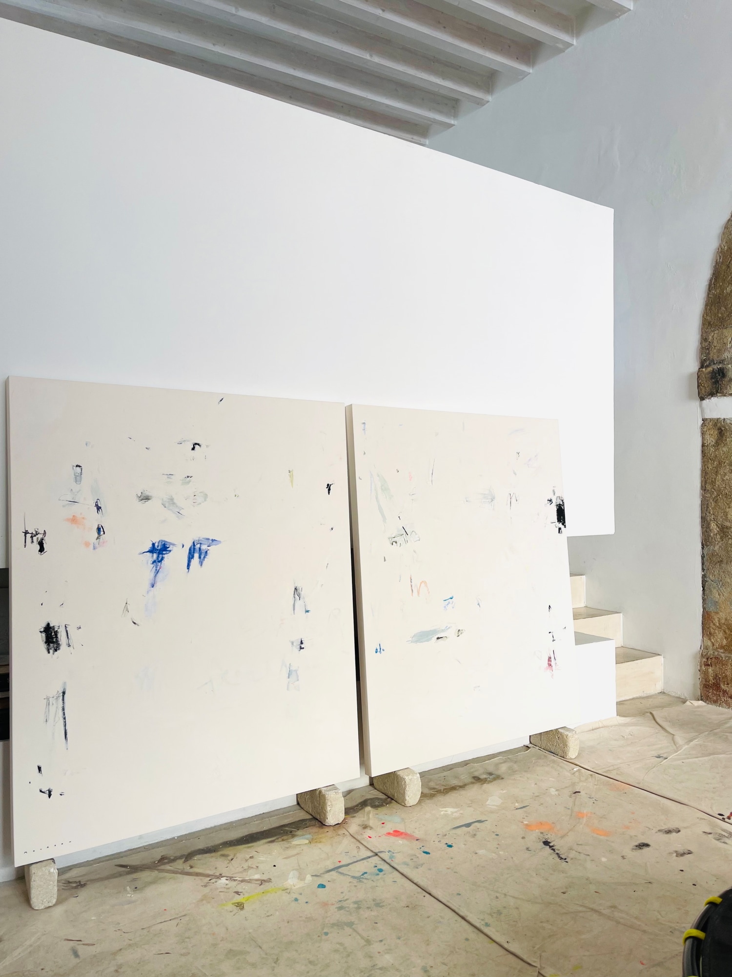 Acrylic, plaster, collage, pumice stone, pastels, charcoal and graphite on canvas
