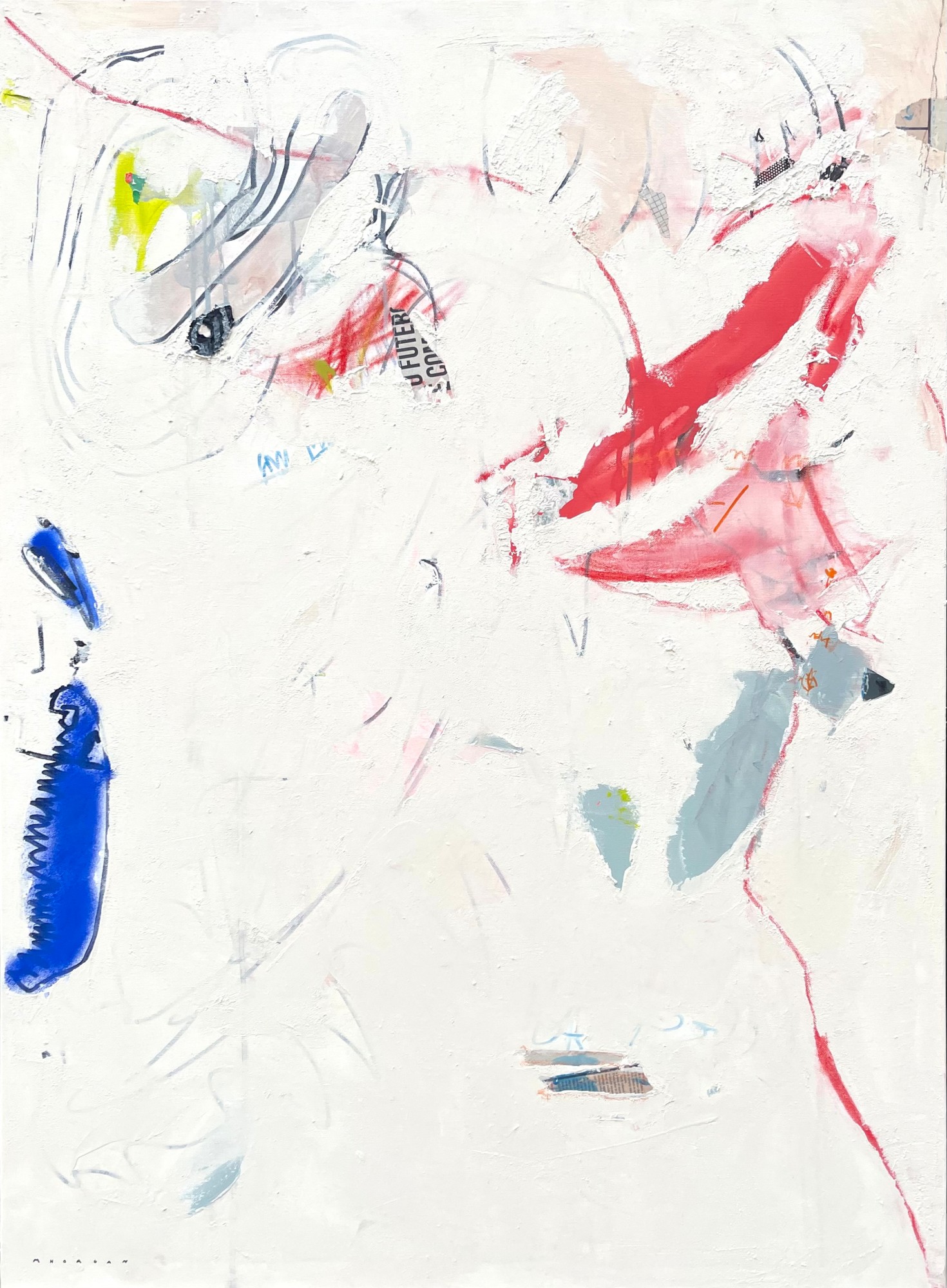 Acrylic, collage, plaster, charcoal, pastels and graphite on canvas