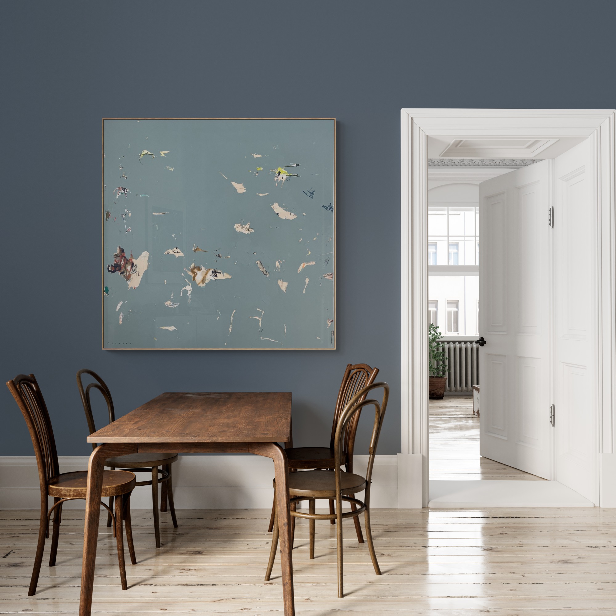 Acrylic, collage, plaster, charcoal, pastels and graphite on canvas