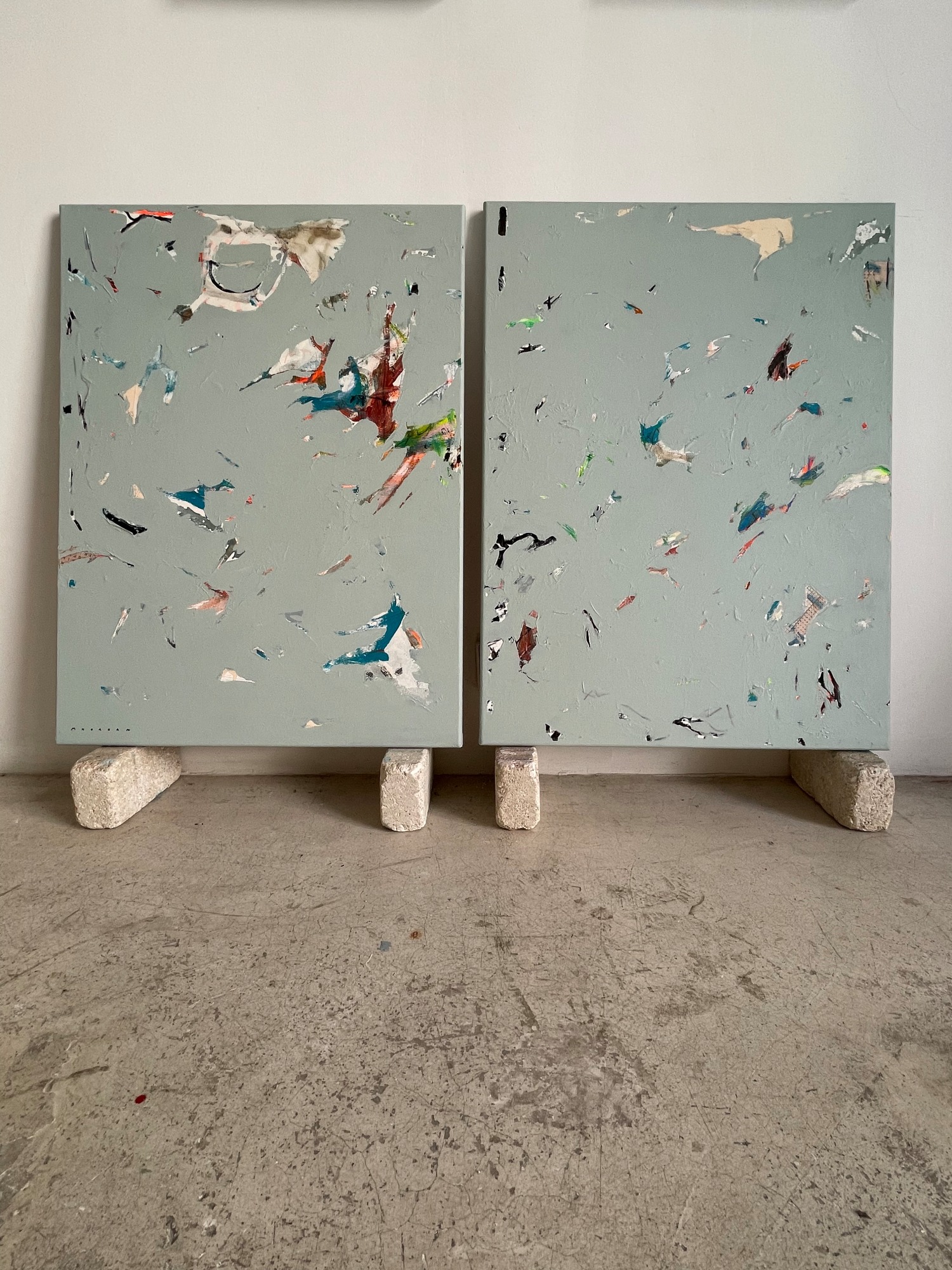 Acrylic, collage, plaster, charcoal, pastels and graphite on canvas