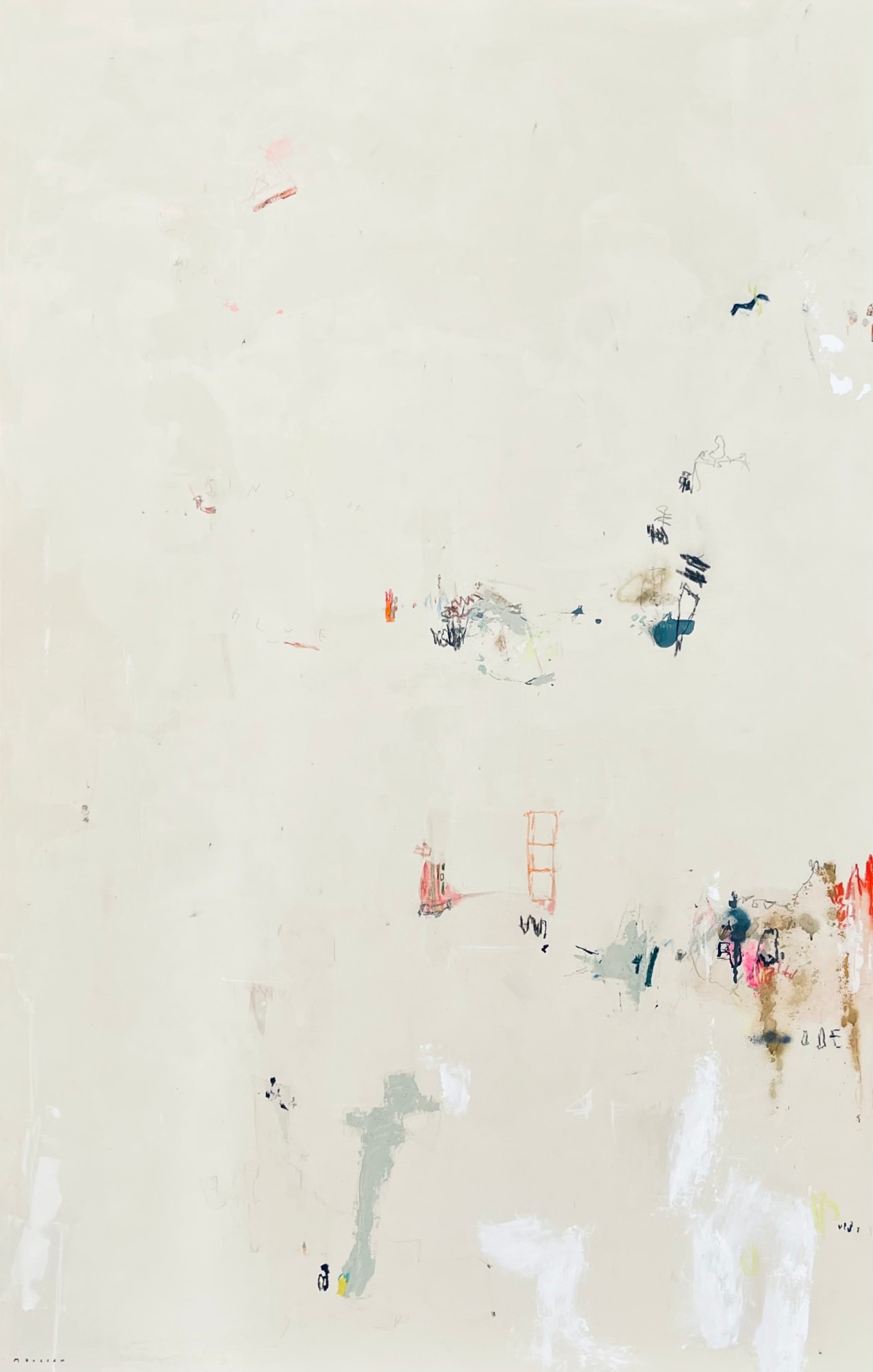 Acrylic, plaster, cement, collage, pastels, pencils, charcoal and graphite on canvas