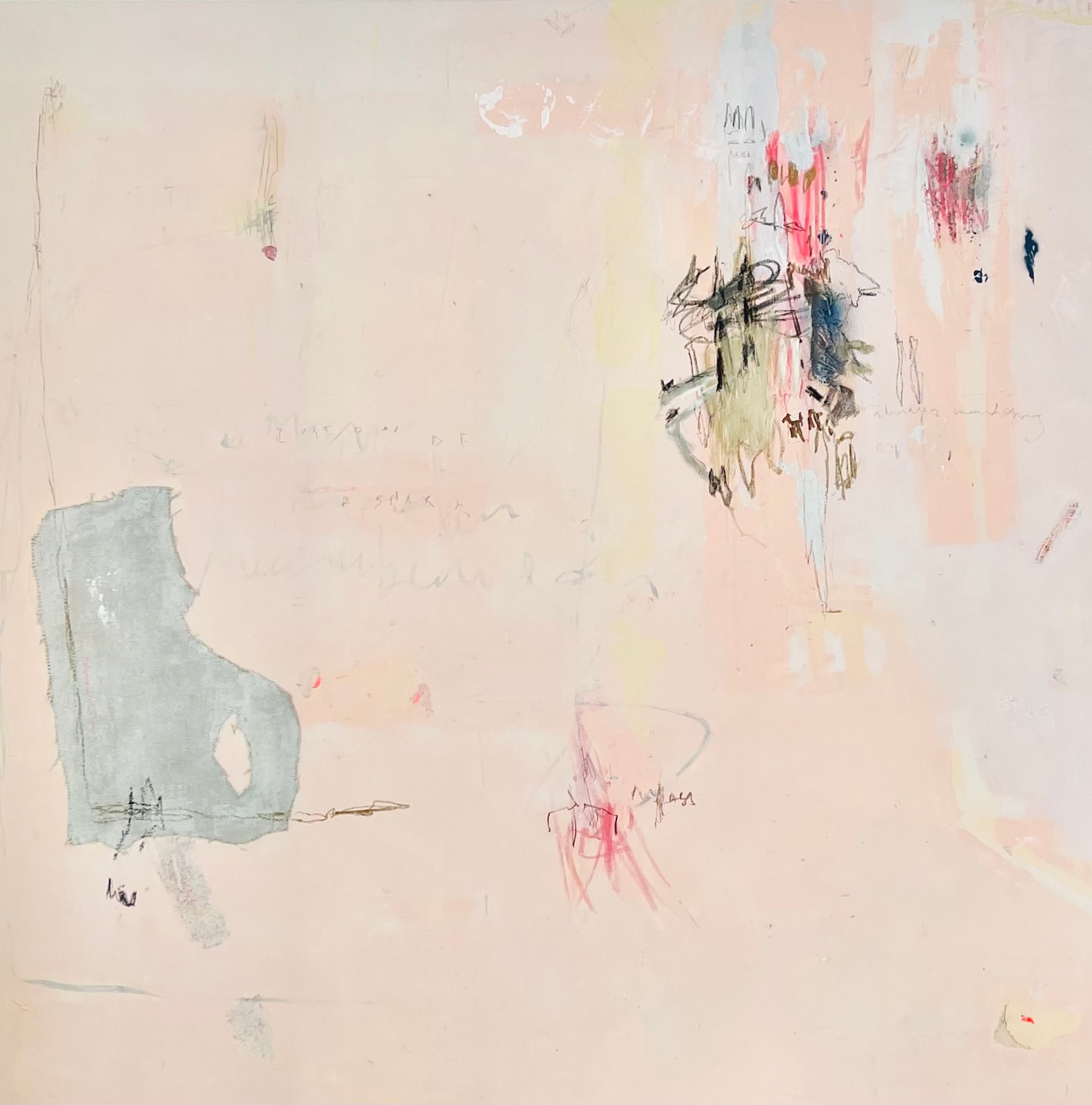 Acrylic, textile collage, plaster, spray paint, dirt, pastels and graphite on canvas