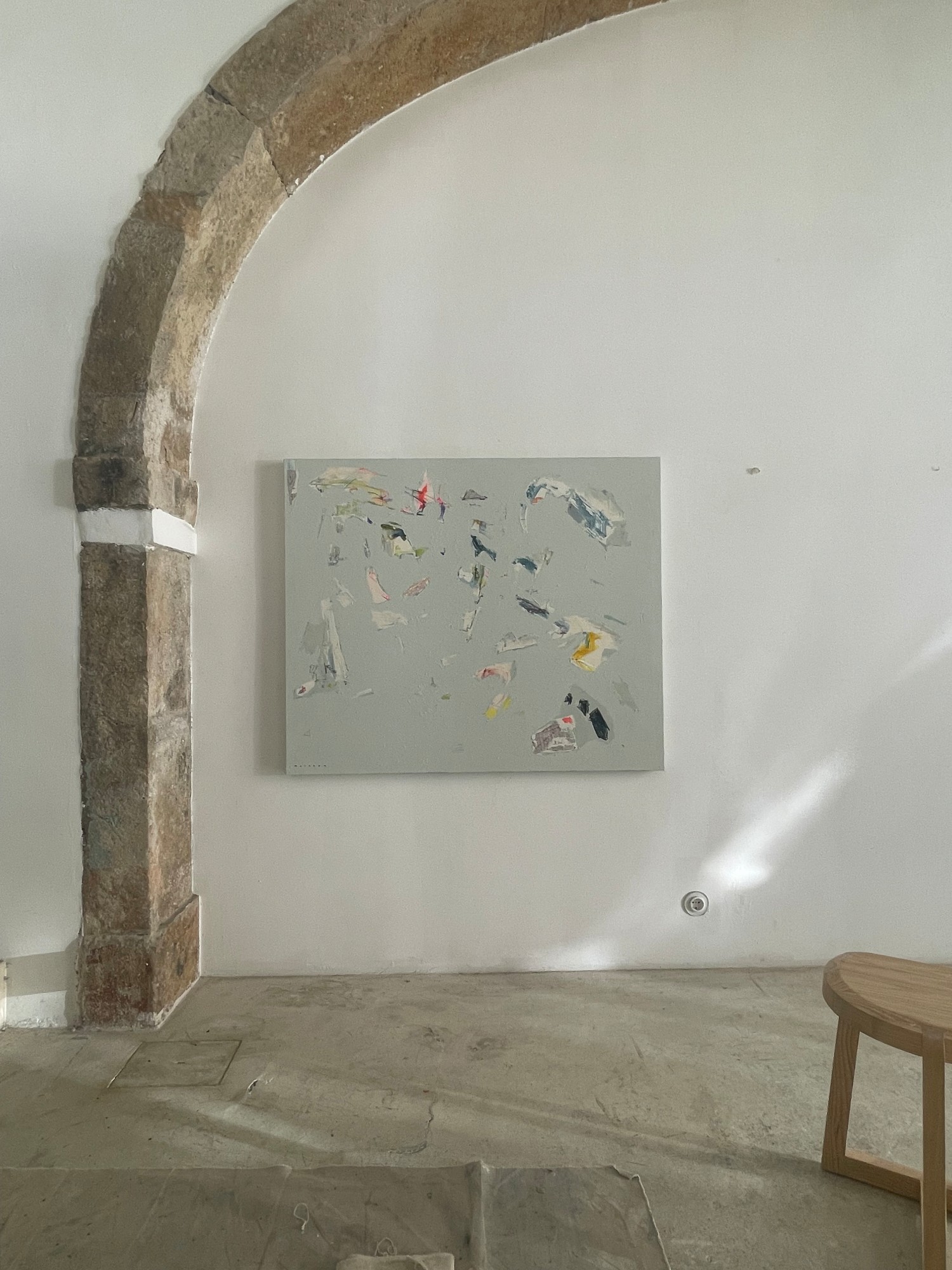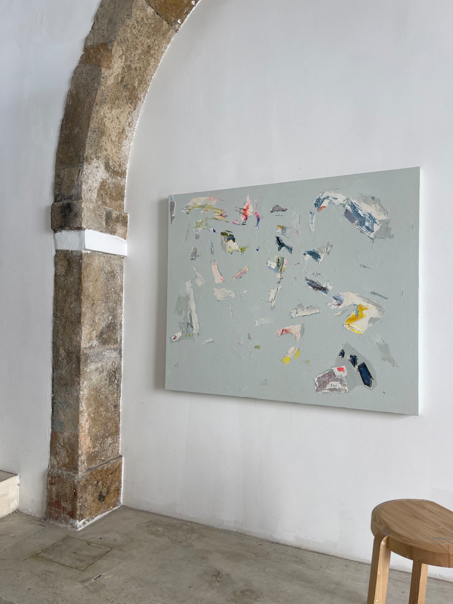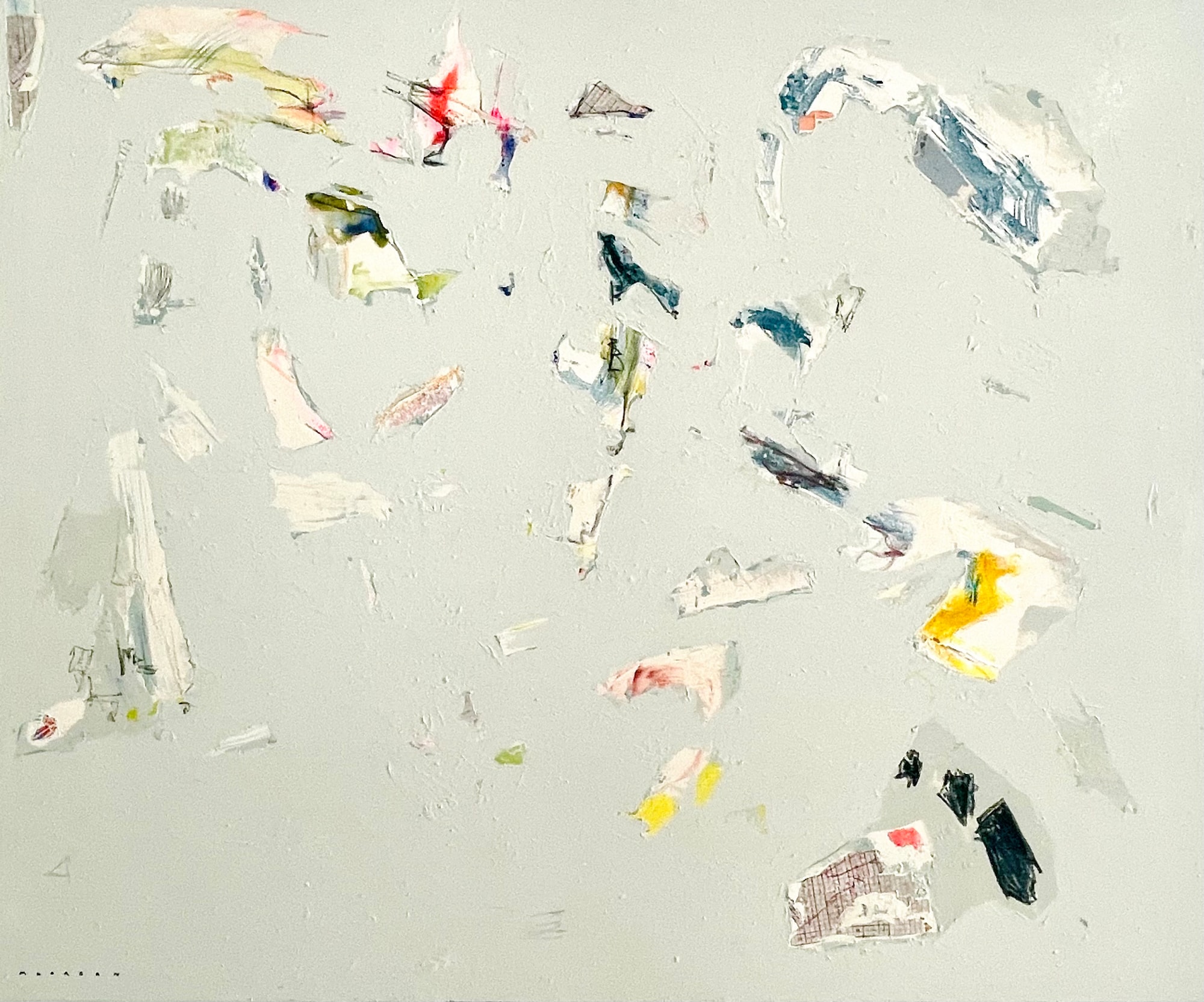 Acrylic, collage, plaster, charcoal, pastels and graphite on canvas