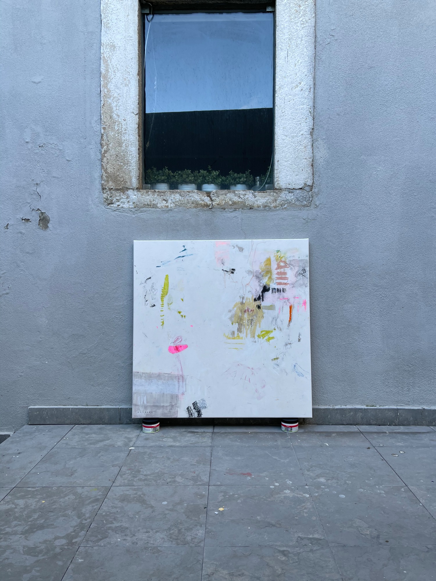 Acrylic, dirt, collage of fabric, plastic and paper waste, pastel, charcoal and pencil on canvas