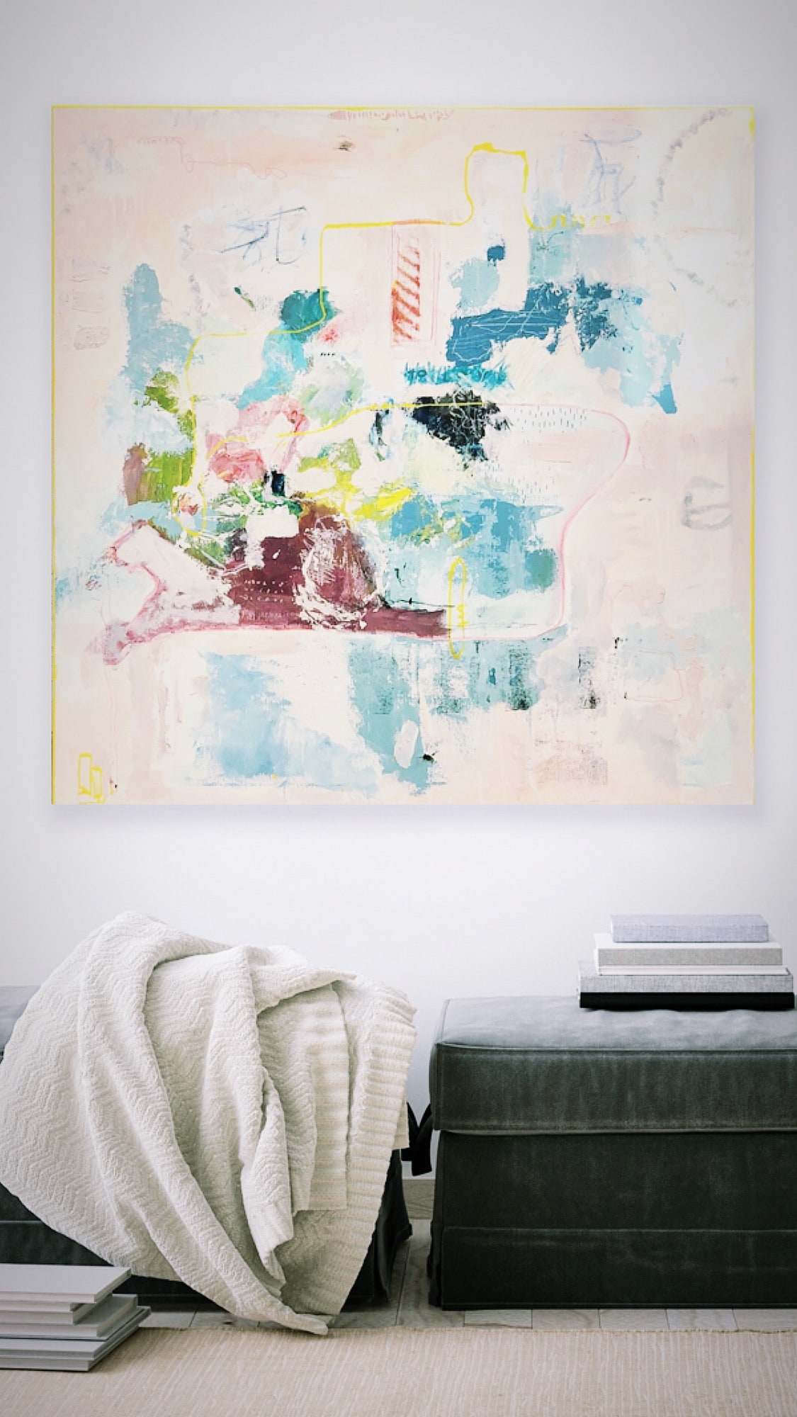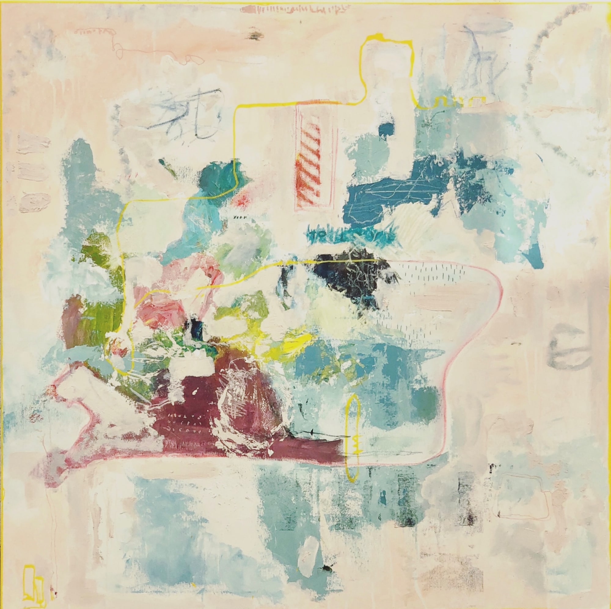 Acrylics, oils, charcoal, modeling paste and pastels on canvas