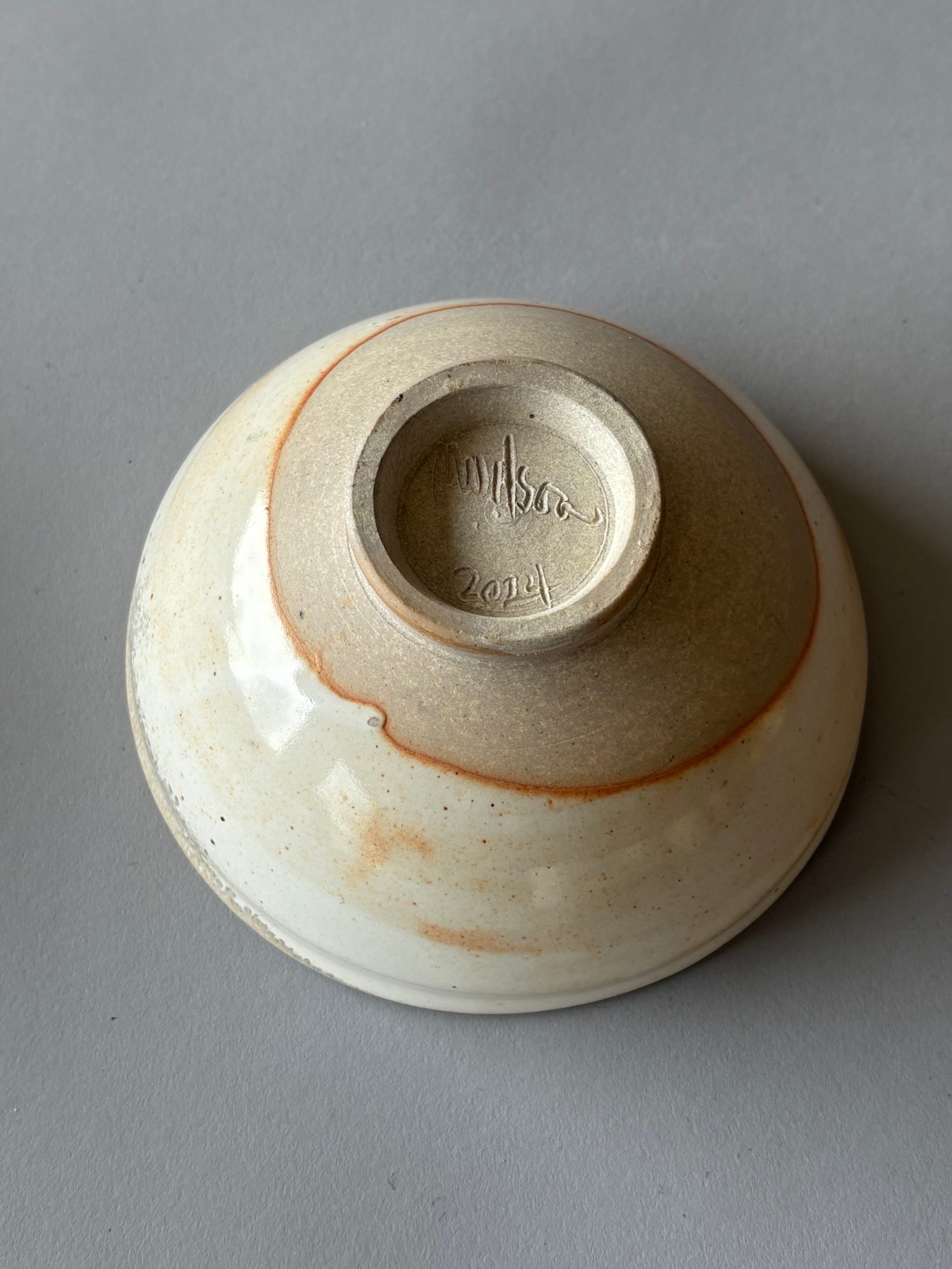 Cone 11 Wheel Thrown, Shino glazed bowl, fired in the Anagama (wood) kiln at the Little Mulberry Pottery, Ozark, Arkansas.