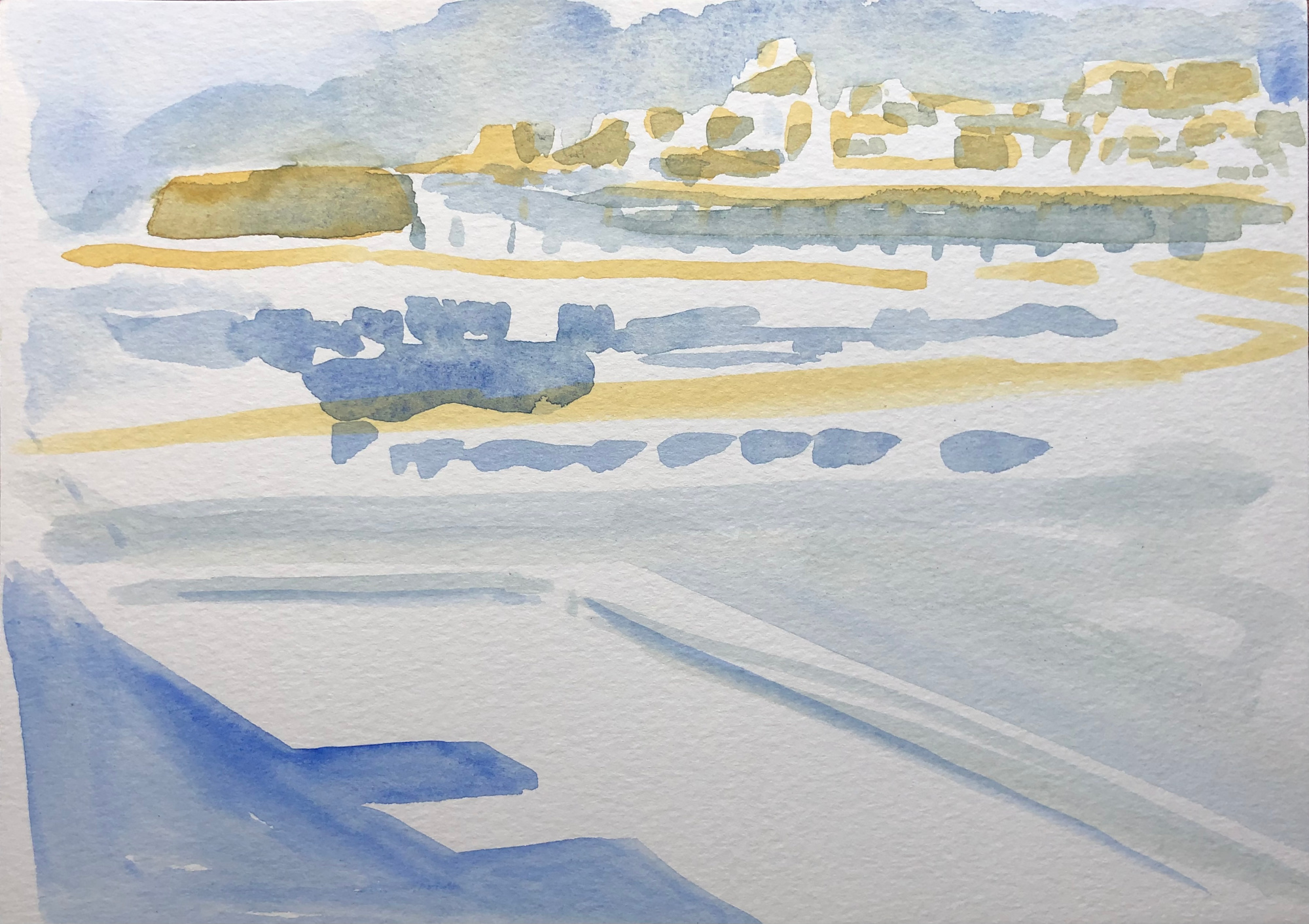 I often painted at the Qal'at Al-Bahrain (Bahrain Fort) Site Museum in the shadow of the fort. Ironically, this spot on the northern coast of the island of Bahrain was rare in providing access to the sea for the public. Urban development and land reclamation made it a challenge to enjoy the surrounding Arabian Sea (Persian Gulf). See: