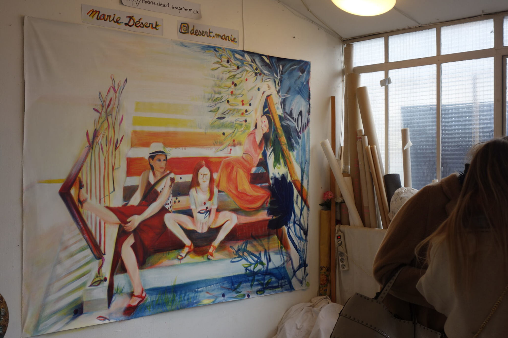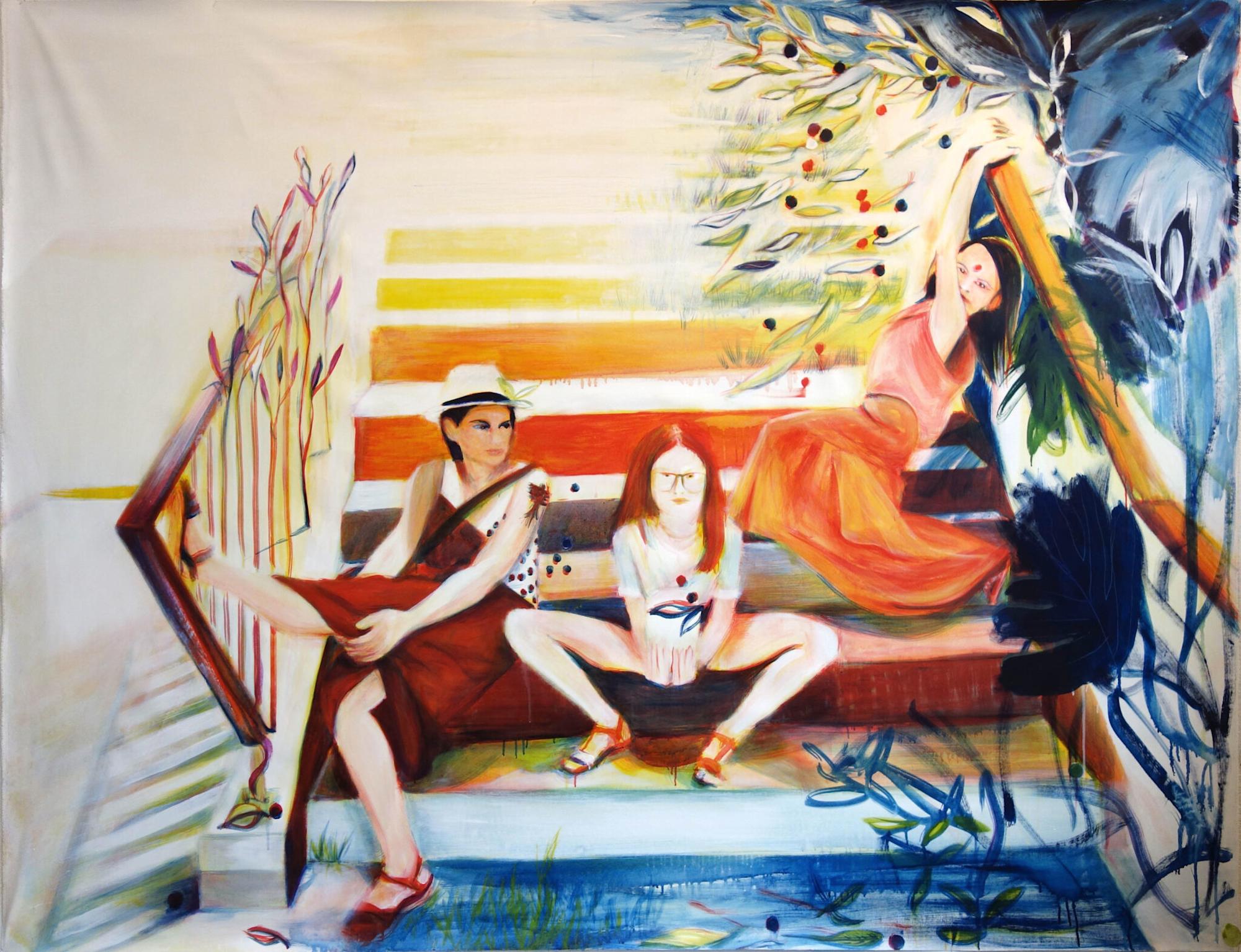 Inspirée d’une photo prise au MO.CO. de Montpellier, avec une de mes chères amies, sa fille et sa copine. Ces postures totalement spontanées m’ont fait penser au radeau de la Méduse. Peinture réalisée au 59 Rivoli, Paris.