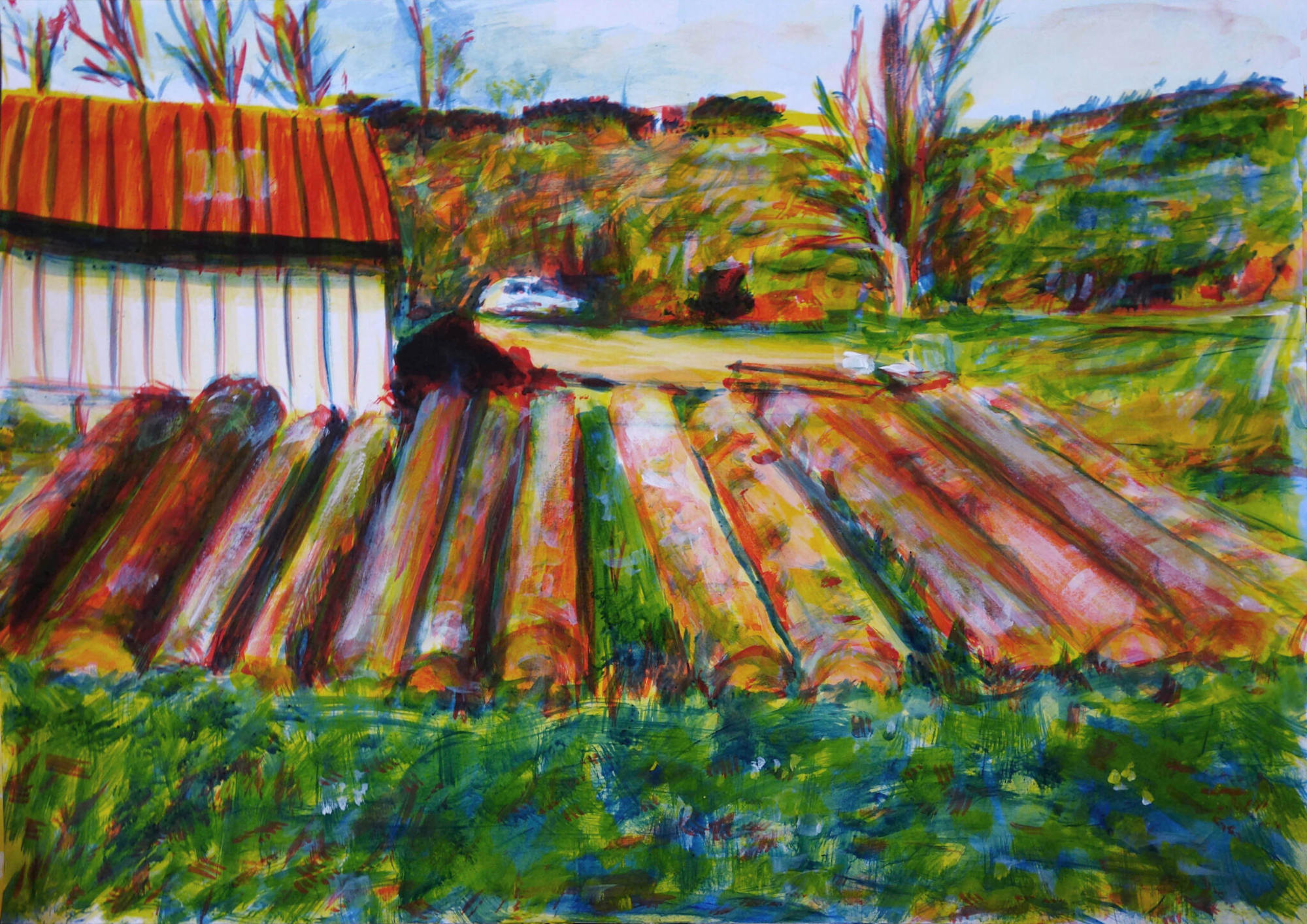 Cette peinture fait partie d’une série d’environ 20 peintures. A leur origine, une résidence de création dans le Puy-de-Dôme avec la journaliste Valérie Ganne, et l’écrivaine Nassera Tamer. Lors de randonnées j’ai pris des photos qui ont inspirée cette série. L’idée est de décrire la vie entre l’homme et la nature.