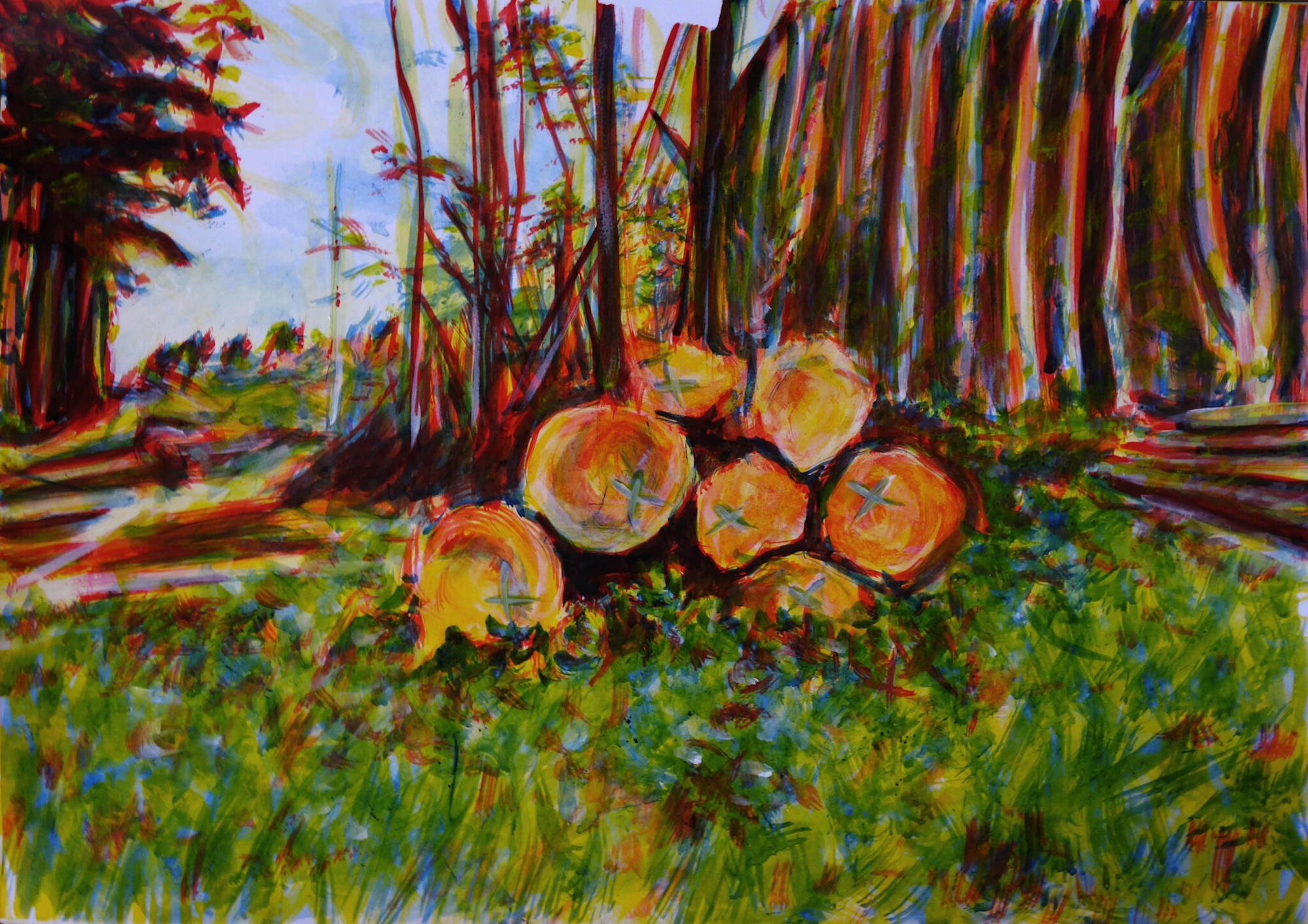 Cette peinture fait partie d’une série d’environ 20 peintures. A leur origine, une résidence de création dans le Puy-de-Dôme avec la journaliste Valérie Ganne, et l’écrivaine Nassera Tamer. Lors de randonnées j’ai pris des photos qui ont inspirée cette série. L’idée est de décrire la vie entre l’homme et la nature.