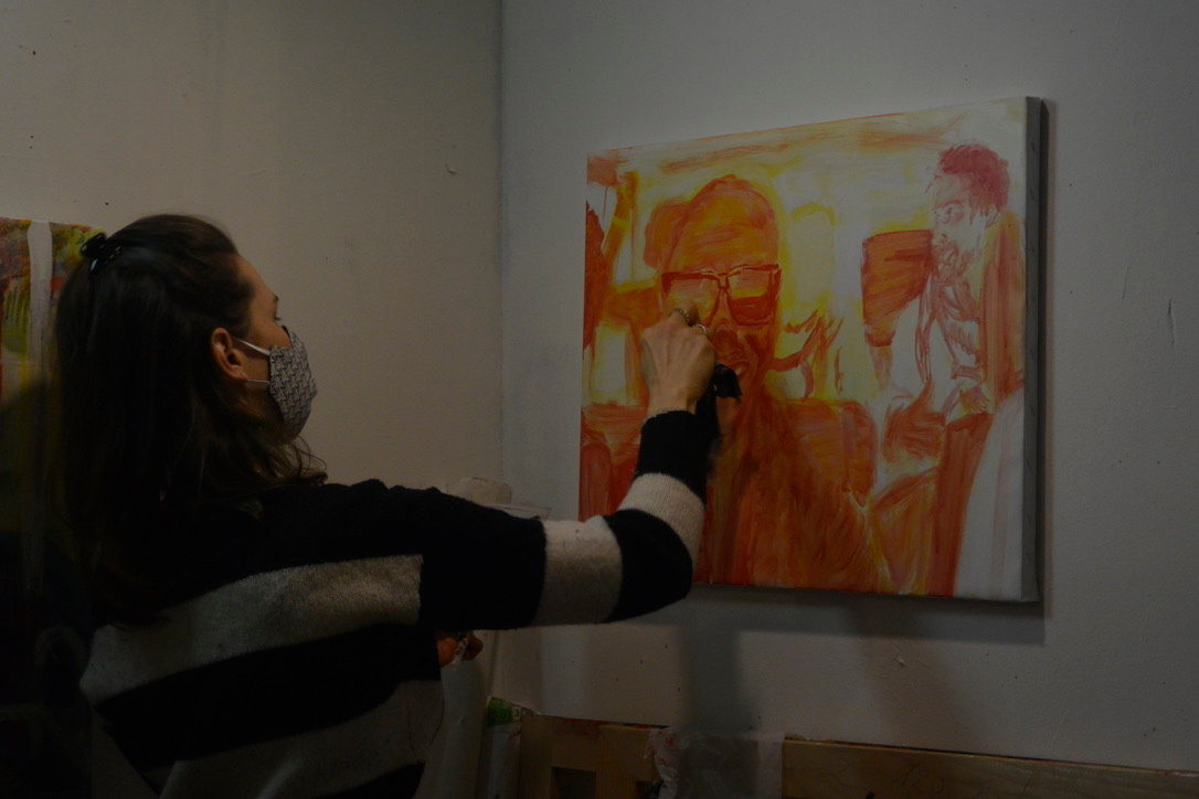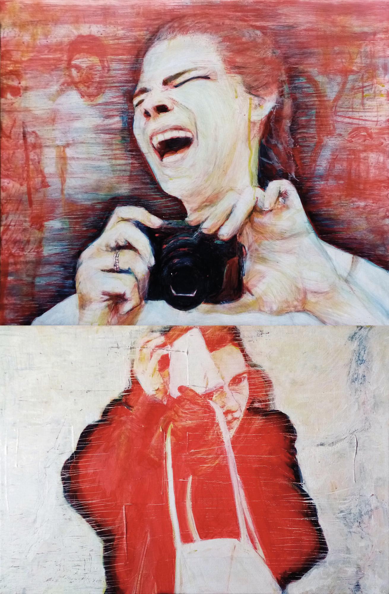 Ce diptyque est constitué de 2 toiles de 38×55 cm et de 46×55 cm. Il questionne la temporalité dans laquelle nous nous trouvons lorsque nous photographions. Le moment photographié vaut-il plus que le moment présent ? Sommes-nous conscients des personnes qui se trouvent devant l’objectif ? Quel souvenir nous reste-t-il de l’instant photographié ?