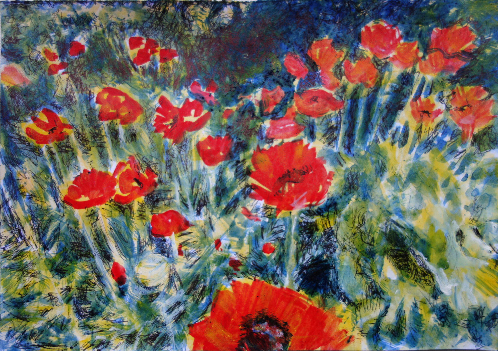 Inspirée d’une photo cette oeuvre a été réalisée à l’atelier 59 Rivoli. Le stylo vient rehausser par endroit le dessin des fleurs. L’utilisation de pigments permet de garder la couleur contrastée que nous offre la nature.