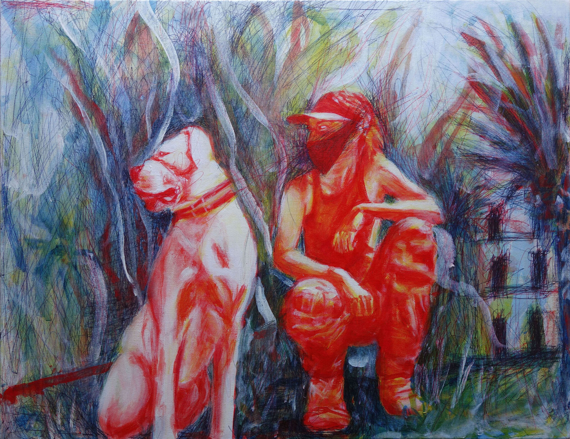 Série Youth Go Ahead. Cette peinture est inspirée de la photo d’une éleveuse de chiens, trouvée sur un réseau social. Elle a été exposée en septembre 2023, lors des Portes Ouvertes d’Ateliers d’Artistes de Saint-Maur