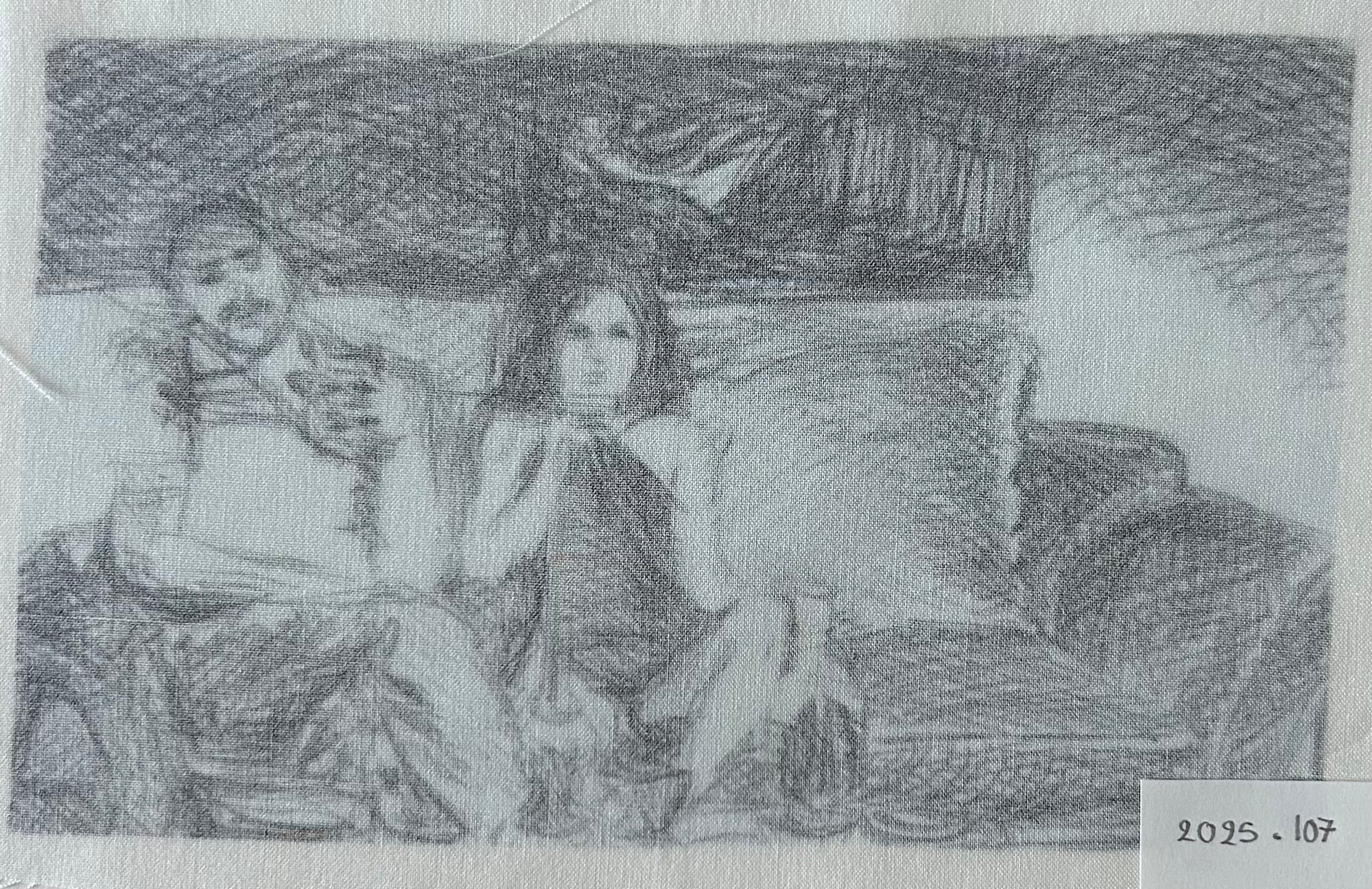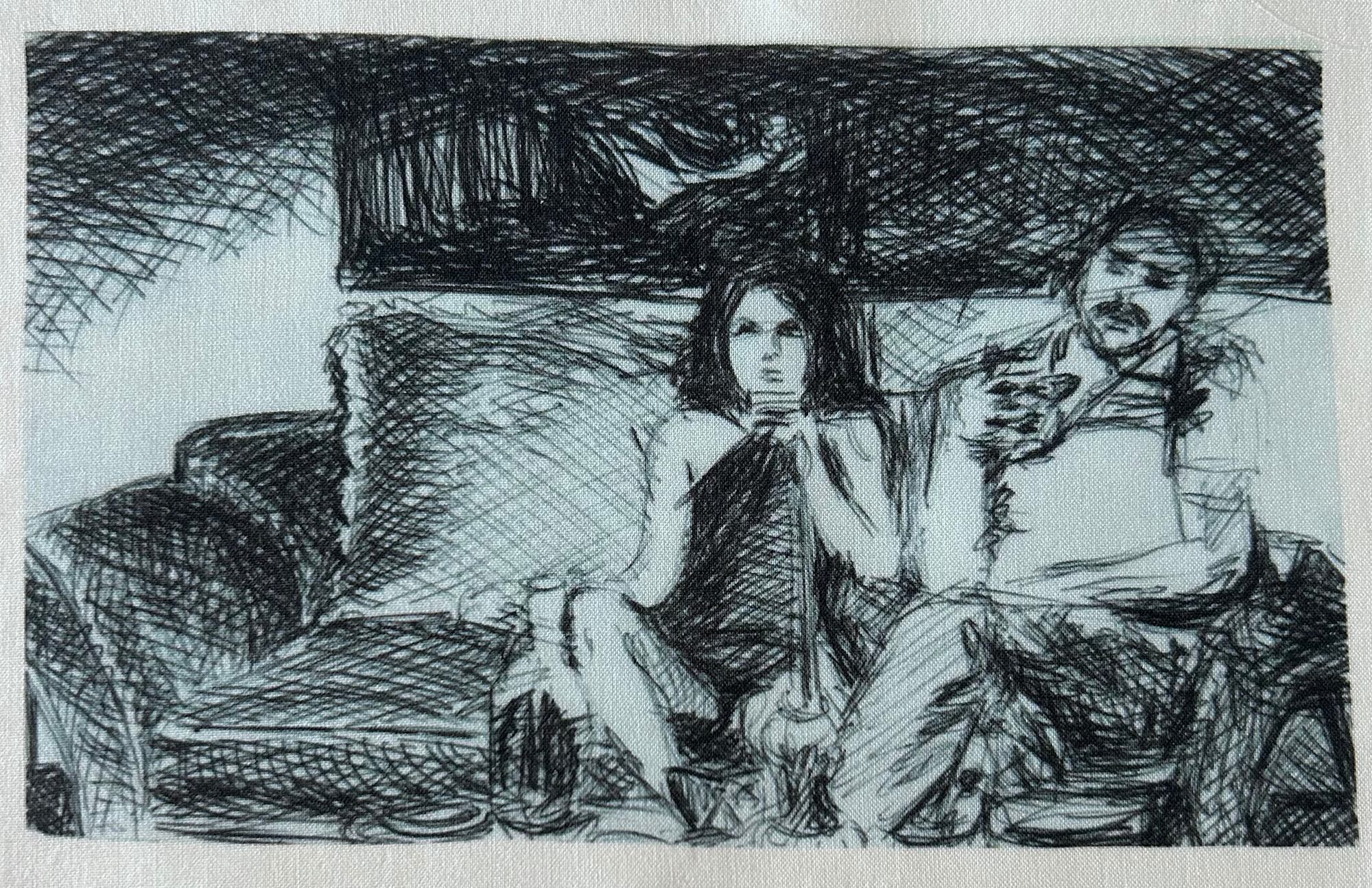 Reproduction sur tissu en 2 exemplaires (1 vendu), de dessins de la série "La vie est un brouillon".
