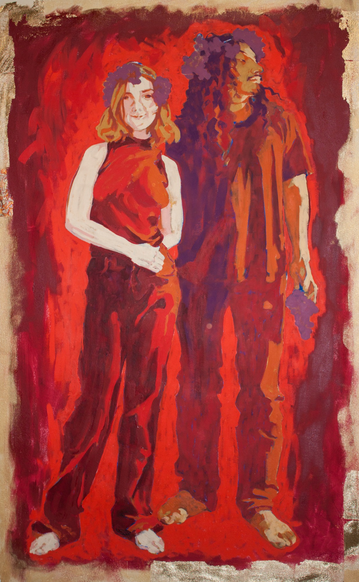 This painting was a reductionist exercise. All of my sketch paintings on unstretched canvas. It was an exercise in using as few colors as I could, to move quickly, portraying movement but still getting a recognizable representation of the model. Each of these paintings has a very rough three-color under-painting and only four to seven finished colors.