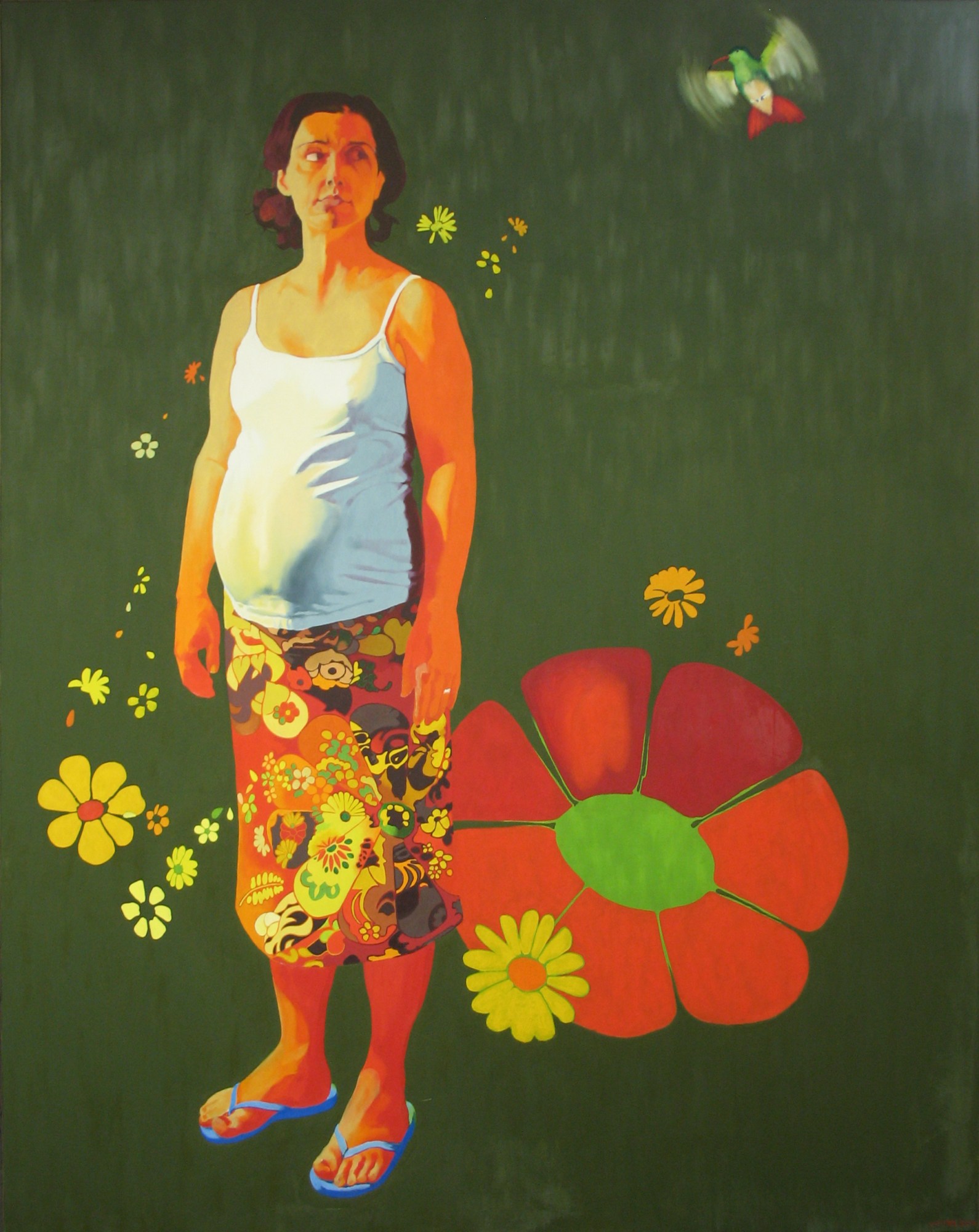 The model inspired this painting. This is not unusual, my creativity is often grabbed by a prospective model before the painting idea comes to me, but in this instance, it was not just the model who inspired me but her writing. This model is a writer, and this painting was inspired by a short story of hers about a woman whose home is taken over by sentient birds. Her skirt ended up also having a significant impact on the painting as the flowers on migrated off it and onto the painting’s background. I had such fun painting all the various bright colors on this over life-sized canvas. This painting is part of my Literature and Art grouping.