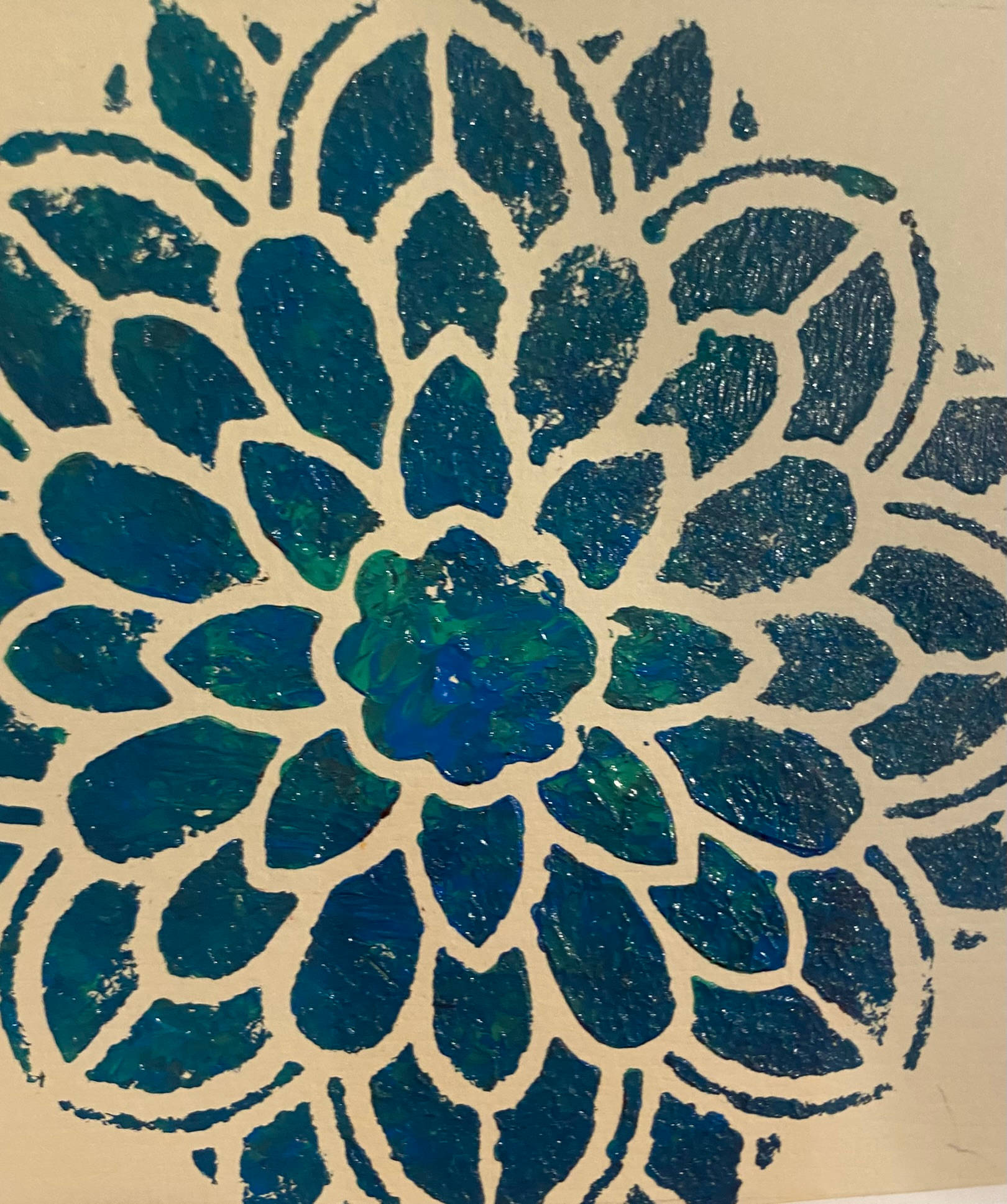 Stencil Print-Acrylic, Mandala, Green and Blue with mat and backboard