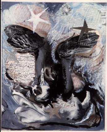 photograph, paper, ink, conte crayon, pastel, sequins, feather