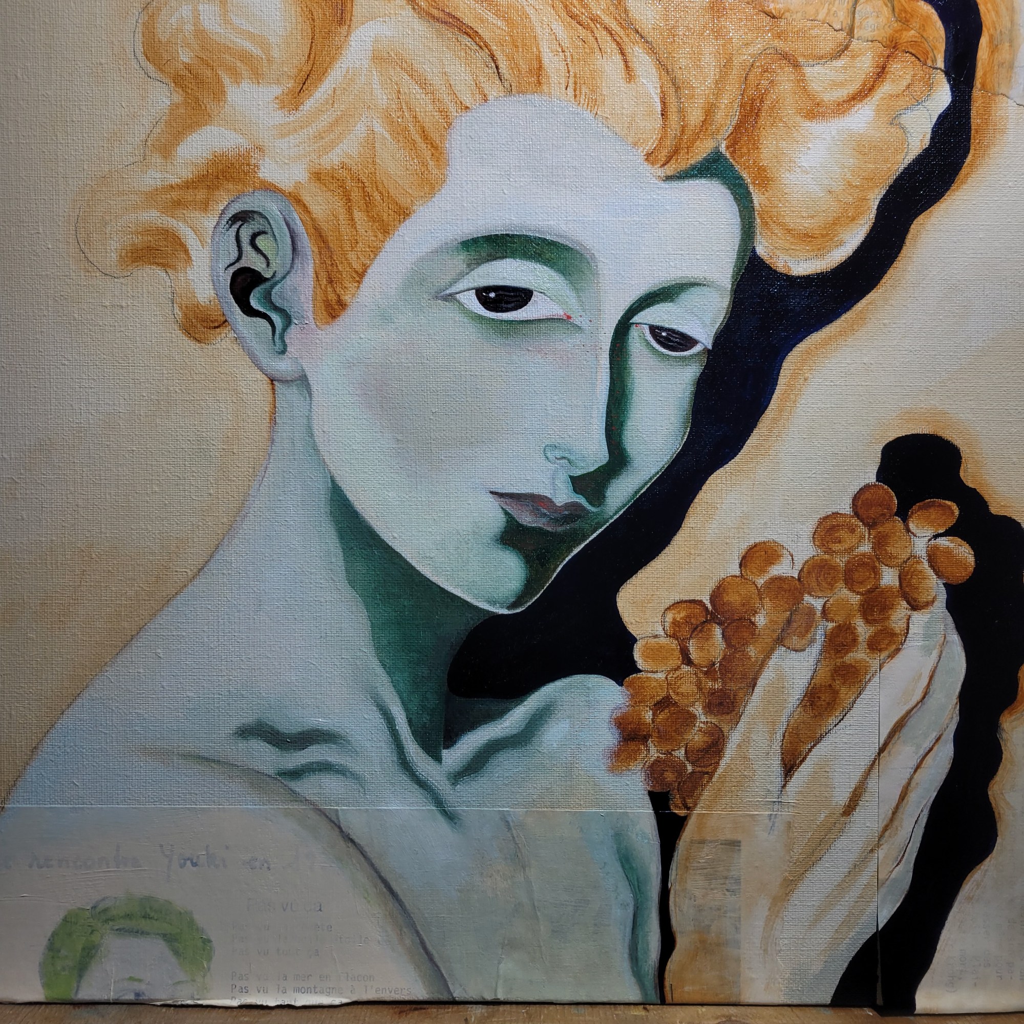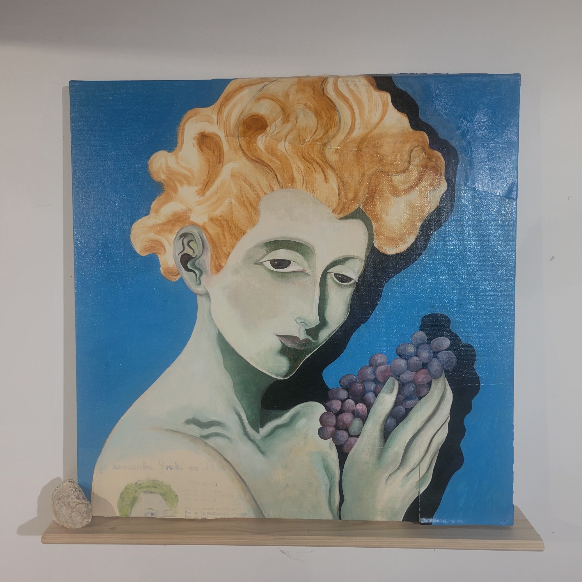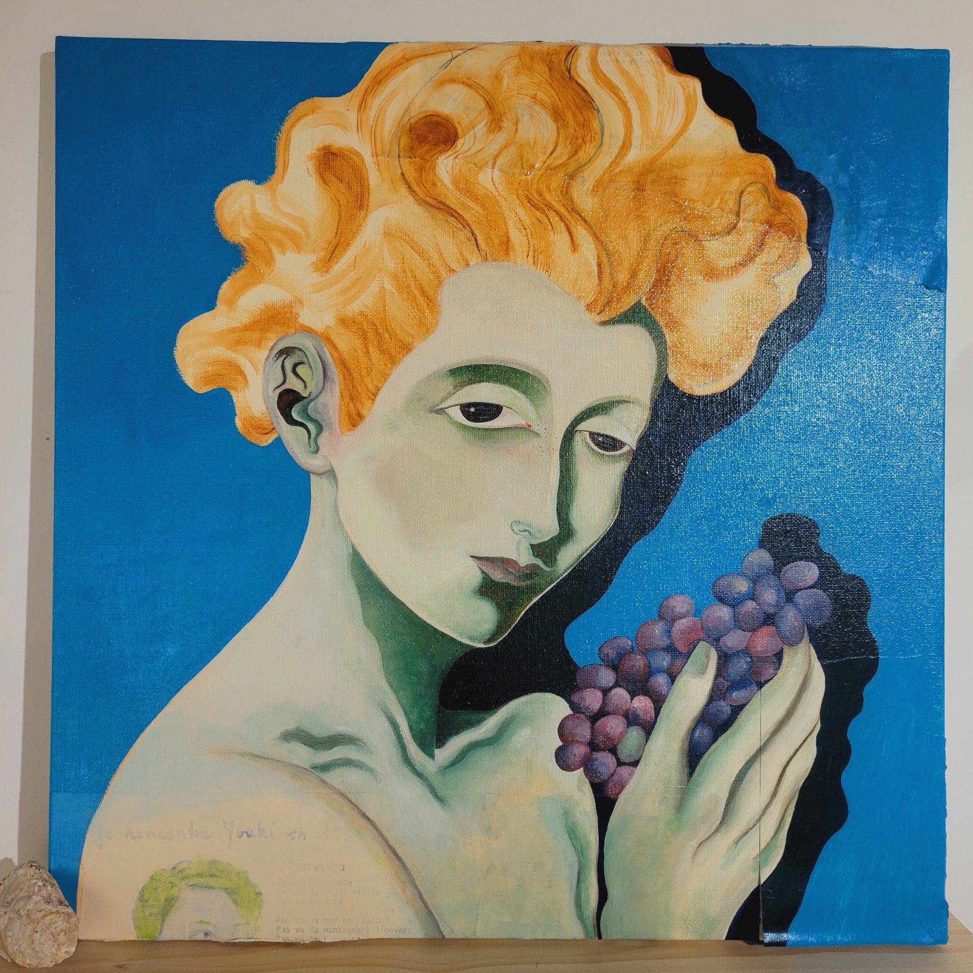 La mademoiselle is a representation of an iconic lady, holding gently a cluster of grapes, looking directly to you with patience. According to Marina, this iconic bouffant hairstyle was very much inspired by the delicate beauty of Doña Margarita Torres. Is her the green grape?