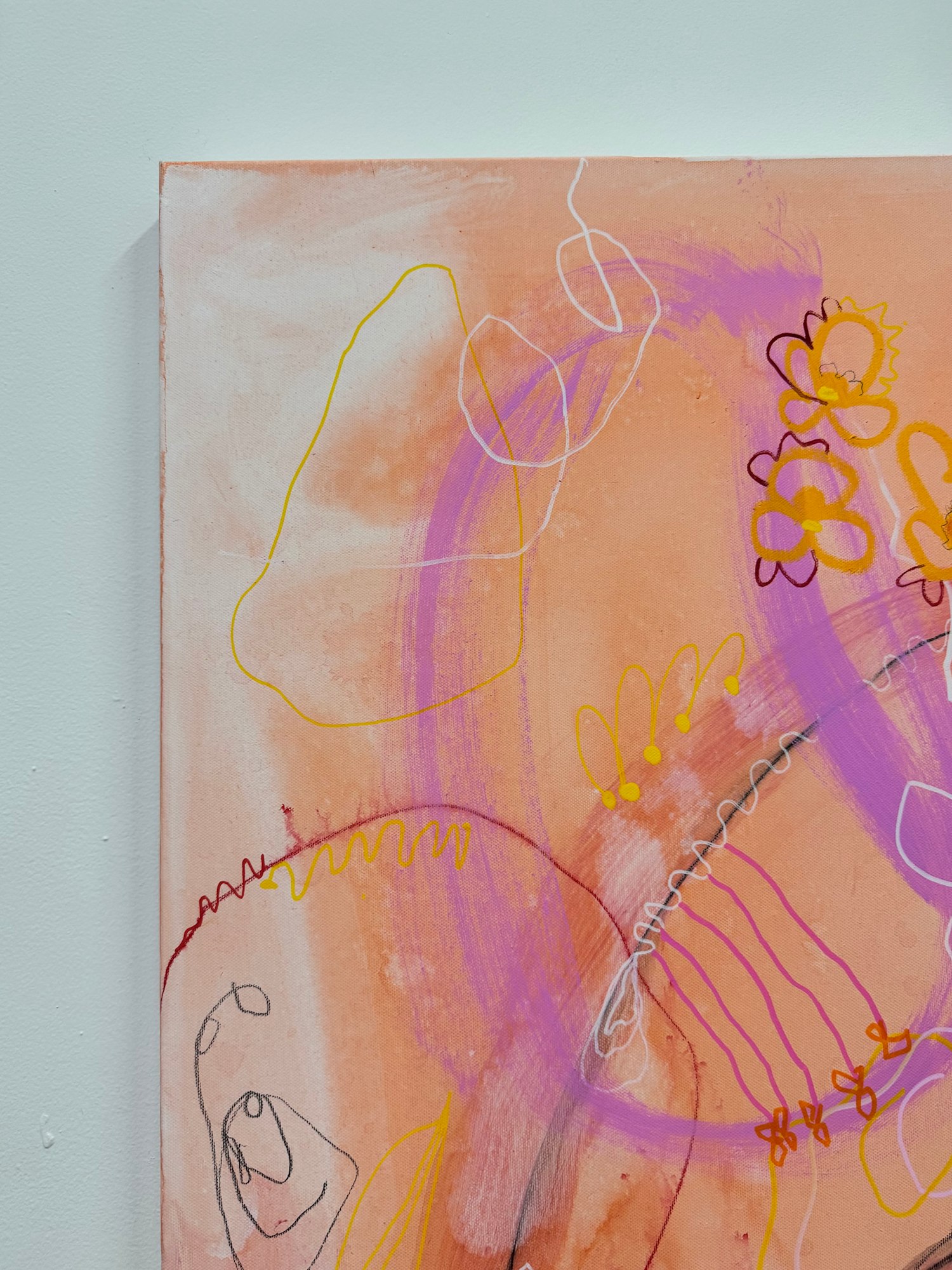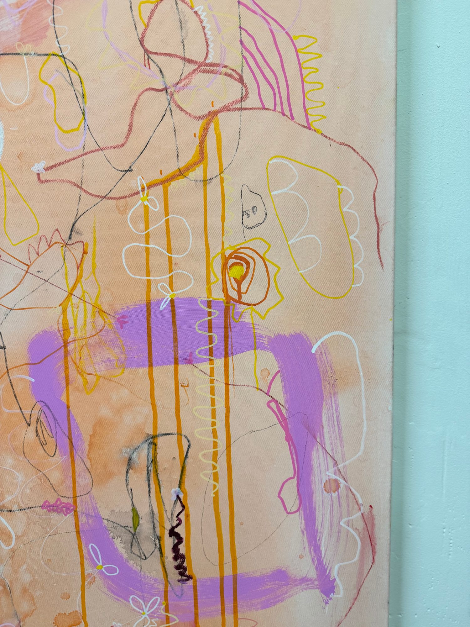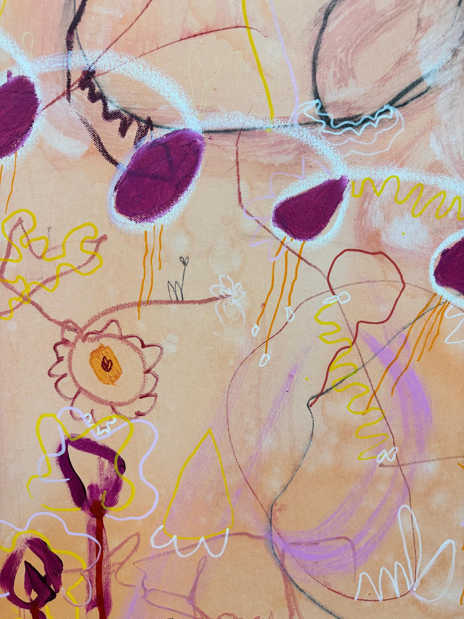 "Say That Again" and "But Louder This Time" are a diptych—two pieces that complete the thought together. They were built from that familiar feeling of being told to stay in line, follow the rules, smile more, quiet down. But all I could hear in my head was me saying "SAY THAT AGAIN, BUT LOUDER THIS TIME"—with the kind of sarcastic bite that only comes from knowing better. These works are about what happens when you stop nodding along and start making your own rules instead. They’re bold, layered, and intentionally unruly—oil pastels, graphite, acrylic, paint markers, water, acrylic ink—because that’s how it feels when the truth finally cracks through: messy, wild, and completely your own. This is not a whisper. It’s a full-body no to being small. And a loud, clear yes to your own voice.