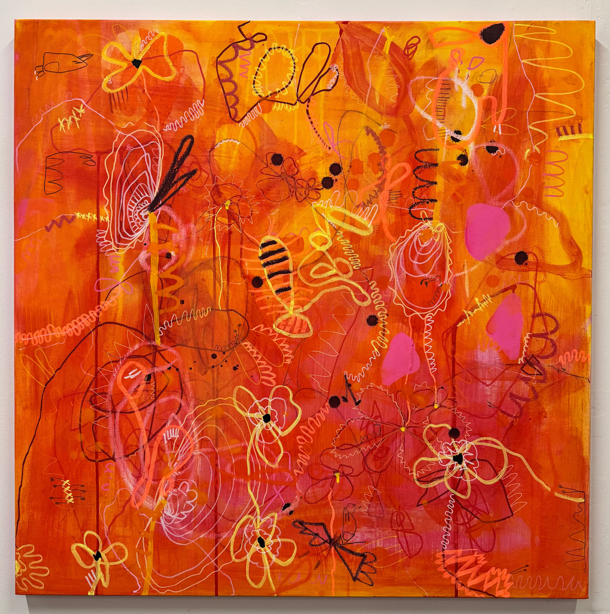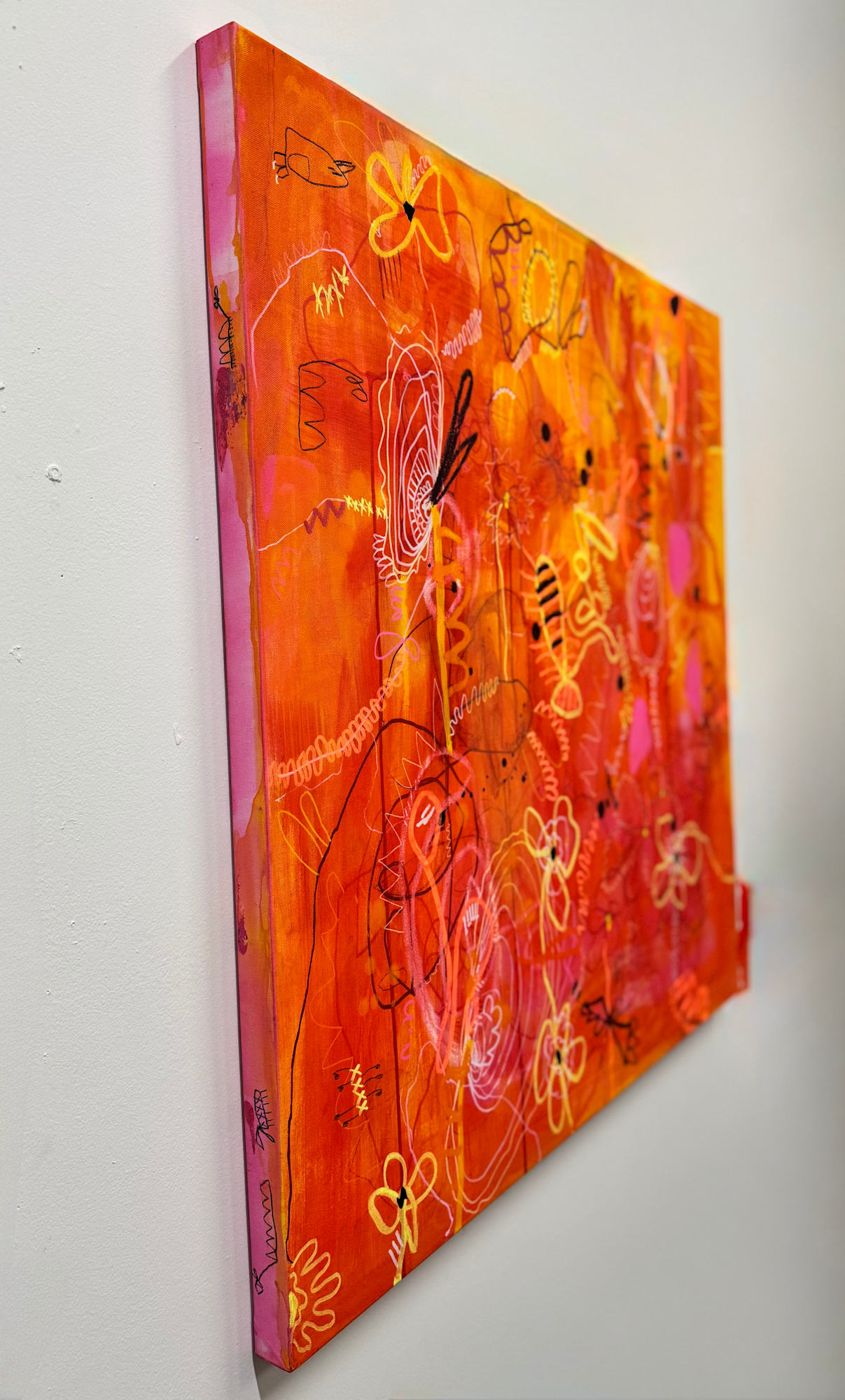 This one buzzes. Like summer heat and scraped knees and the thrill of being outside way past dinner. The pinks and oranges are loud on purpose—like that little girl who never asked for permission to take up space. I painted this thinking about getting lost in the clover fields, face down in the grass, chasing four-leaf clovers but getting distracted by every single petal. That version of me? She never left. She just needed a way back in.